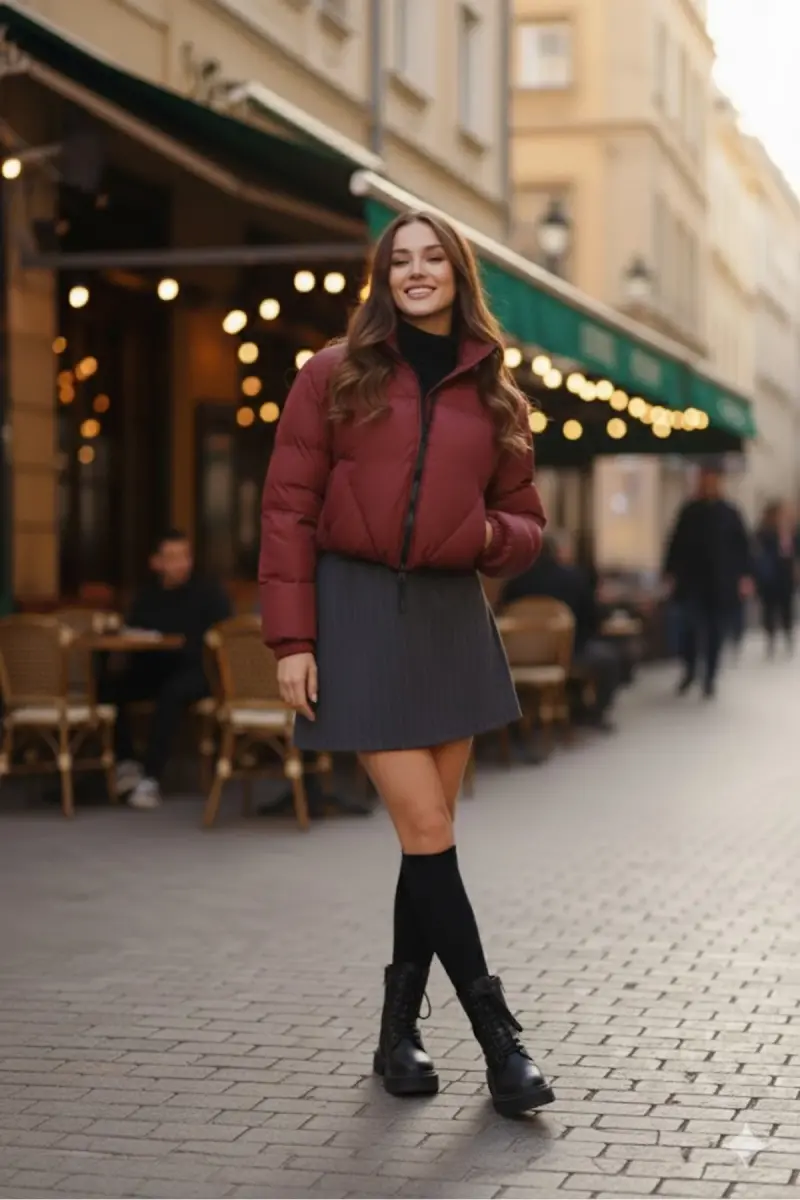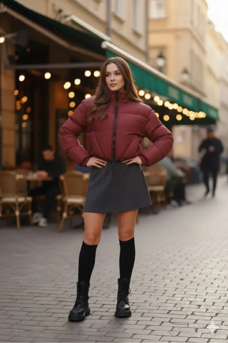 Kadın Yeni Sezon Çapraz Dikişli Kışlık Mont Lastik Detaylı Crop-Bordocropmont4