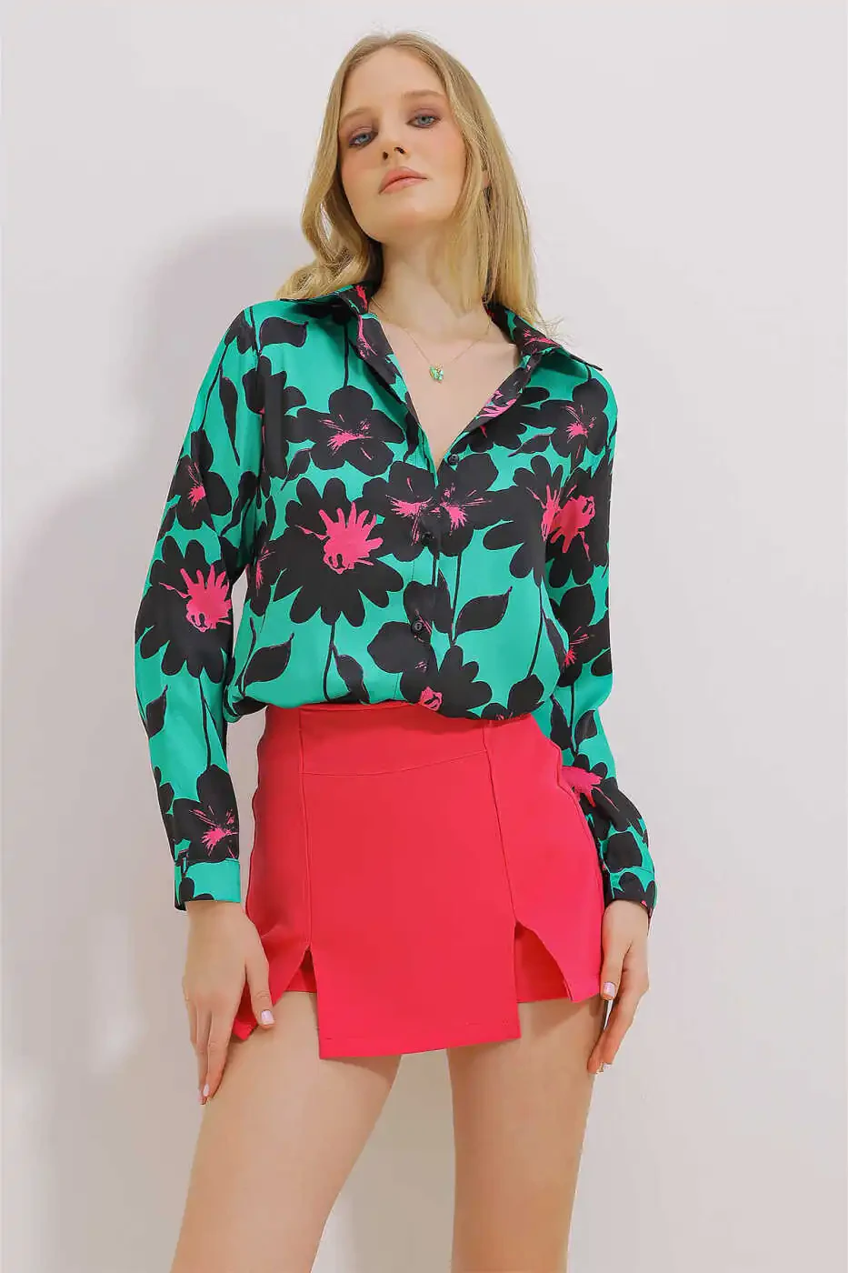 Kadın Yeşil Basic Desenli Dokuma Gömlek ALC-X11445 ile stilinizi tamamlayın!