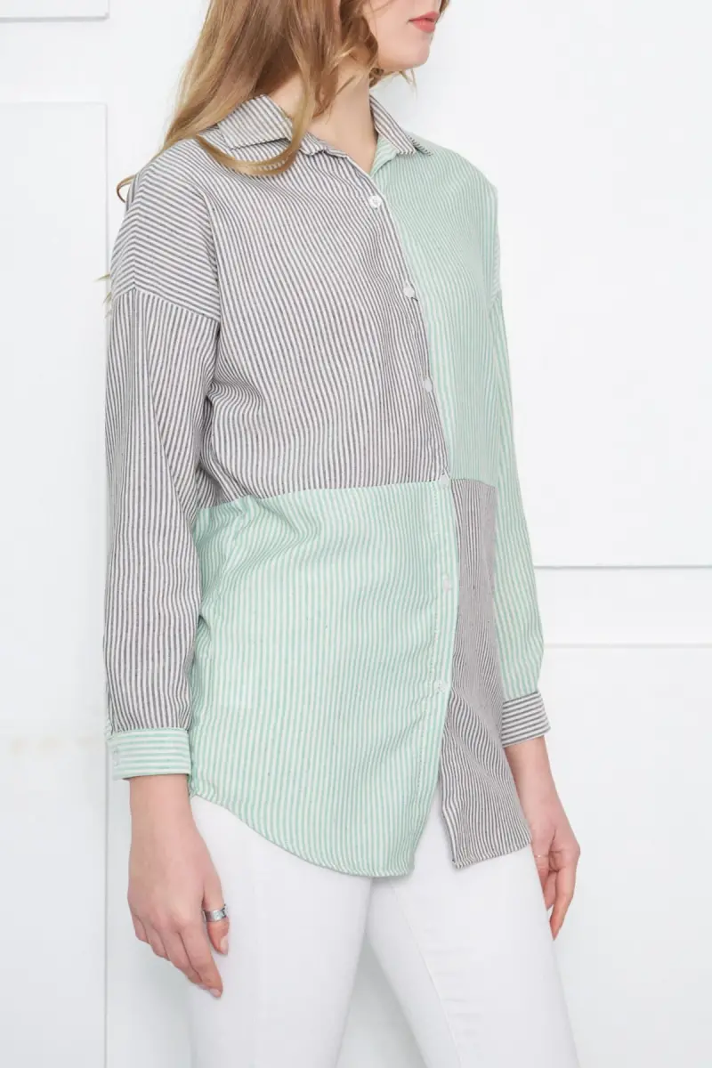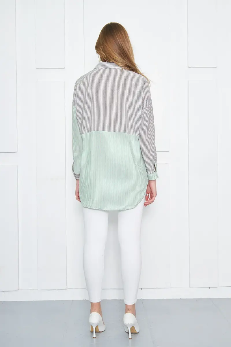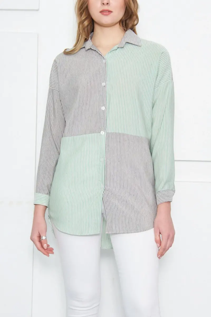 Kadın Yeşil Çizgili İki Renkli Uzun Kol Salaş Gömlek ARM-21K001193-Yeşil