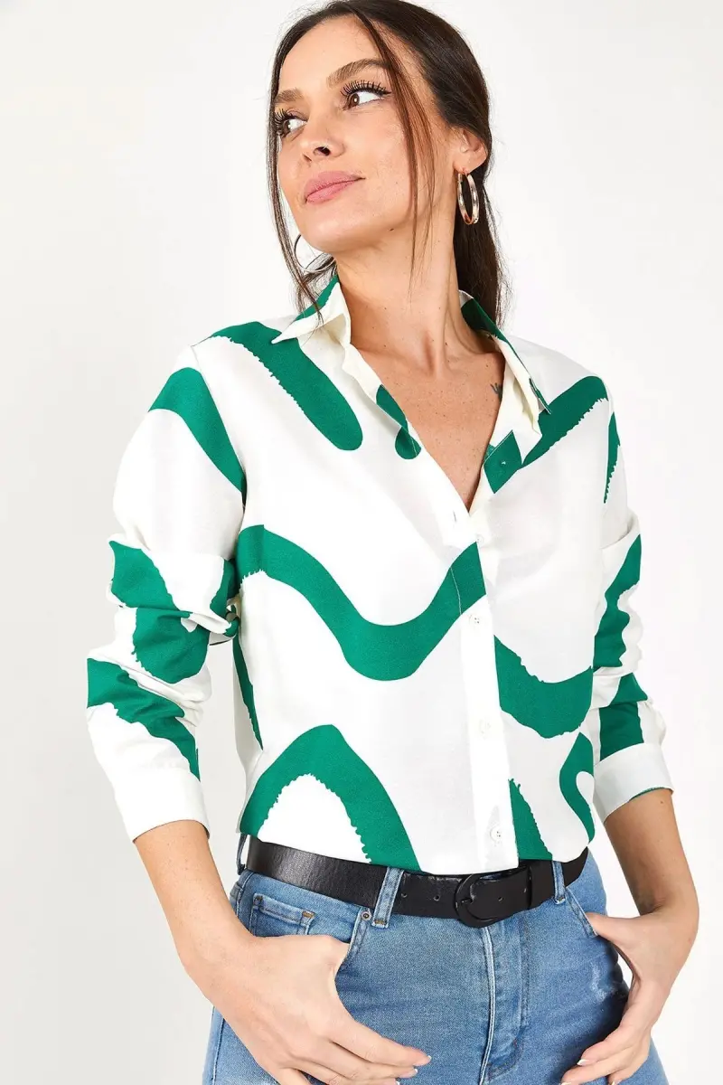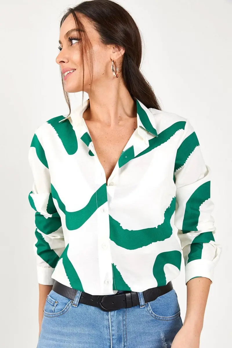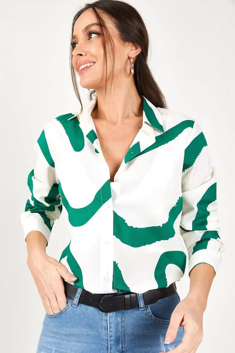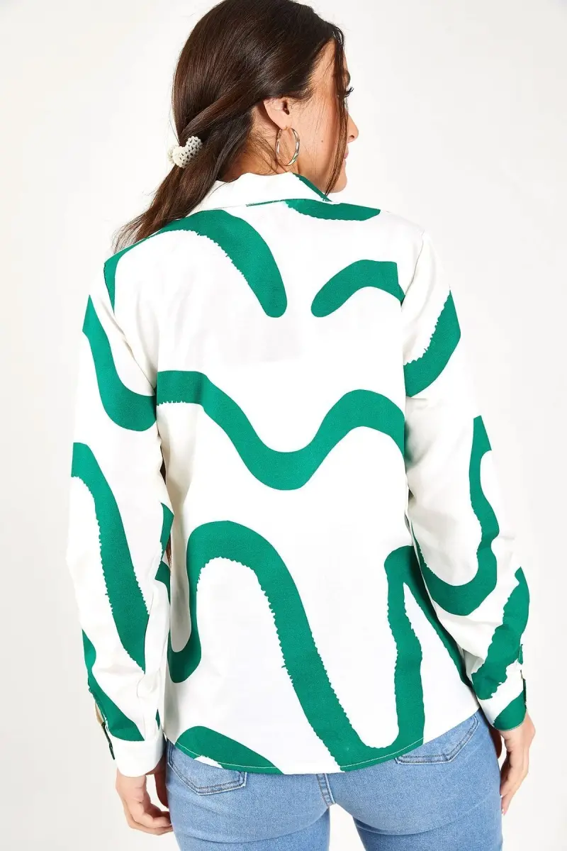 Kadın Yeşil Desenli Uzun Kol Gömlek ARM-22K001123-Yeşil