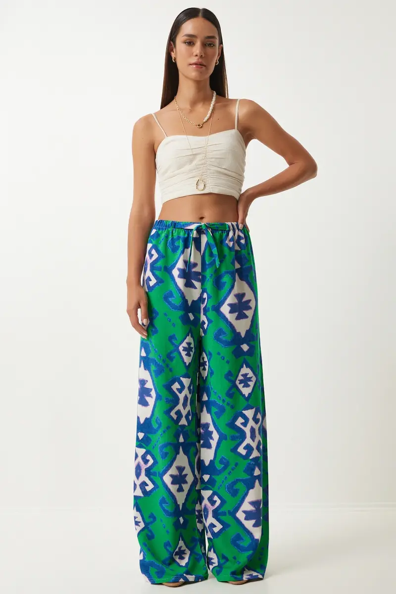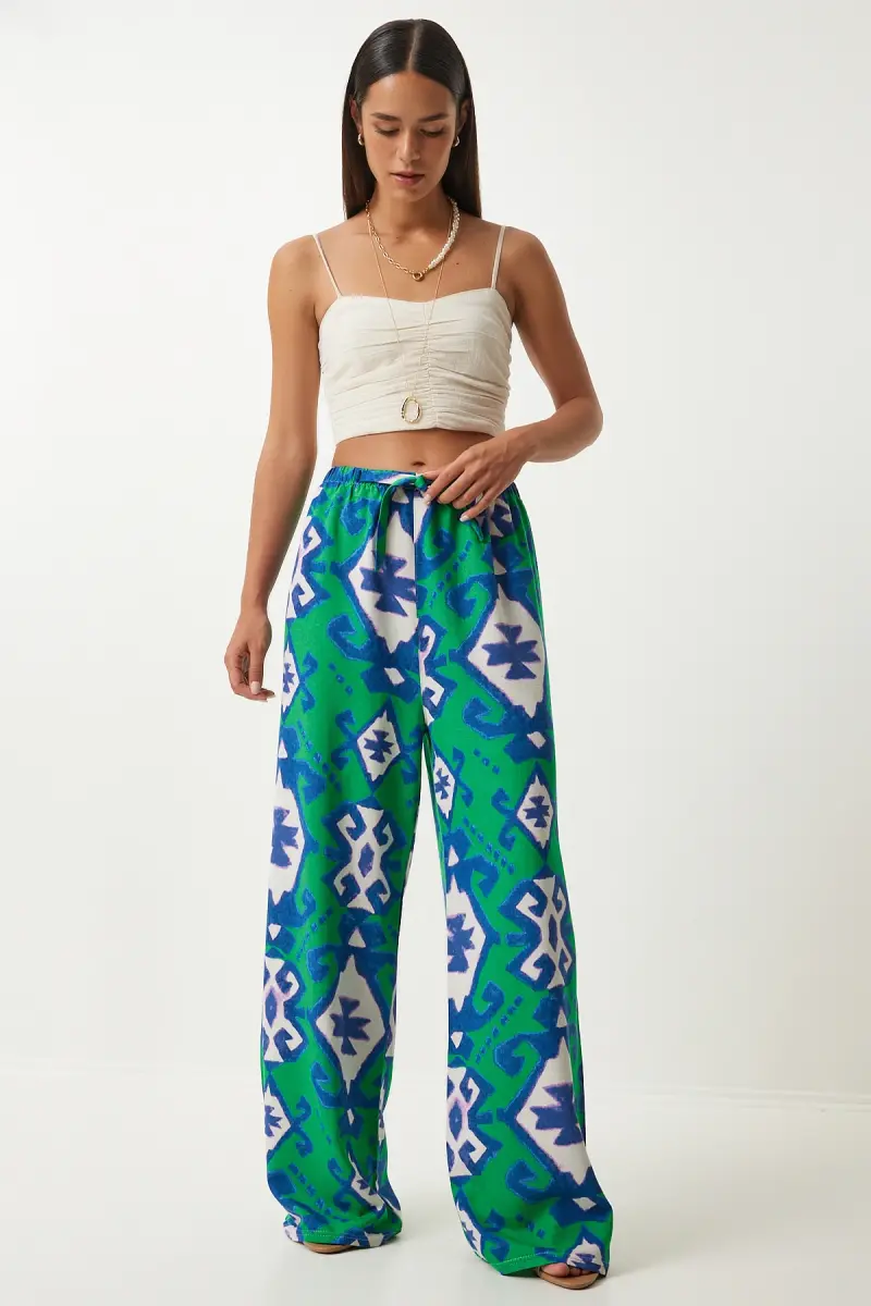 Kadın Yeşil Mavi Desenli Ham Keten Palazzo Pantolon BH00397-Yeşil Mavi