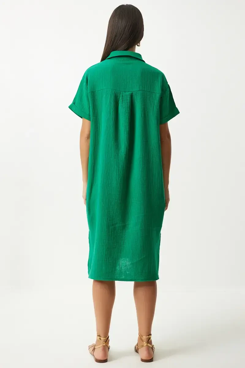 Kadın Yeşil Polo Yaka Yazlık Bol Müslin Elbise, hem konforu hem de şıklığı ön planda tutan kadınlar için ideal bir seçimdir. Elbisenin rahat kesimi, gün boyu özgürce hareket etmenizi sağlarken, polo yaka detayı ise klasik bir dokunuş katmaktadır. Yeşil rengin canlılığı, yaz mevsiminin enerjisini yansıtırken, müslin kumaşın hafif ve nefes alabilir yapısı sıcak havalarda terlemeyi önler ve gün boyu serin kalmanıza yardımcı olur. Elbisenin bol kesimi, vücut hatlarını belirginleştirmeden rahat bir siluet oluşturur, bu da onu her vücut tipine uygun hale getirir. İster sandaletlerle günlük bir kombin yapın, ister şık bir topuklu ayakkabıyla özel bir davete katılın, bu elbise her durumda size eşlik edecektir. Elbisenin tasarımında kullanılan detaylar, modern ve zarif bir görünüm sunar. Polo yaka, elbiseye sportif bir hava katarken, bol kesim ise hareket özgürlüğünüzü kısıtlamaz. Müslin kumaşın doğal dokusu, cildinize yumuşak bir his verir ve gün boyu konfor sağlar. Bu elbise, sadece şık görünmekle kalmayıp aynı zamanda rahat hissetmek isteyen kadınlar için mükemmel bir tercihtir. Gardırobunuzun en sevilen parçalarından biri olacak bu elbiseyi, farklı aksesuarlarla kombinleyerek kendi stilinizi yansıtabilirsiniz. İster bir kemerle belinizi vurgulayın, ister şık bir şapka ile kombininizi tamamlayın, bu elbise her türlü kombinasyona uyum sağlayacaktır. Kadın Yeşil Polo Yaka Yazlık Bol Müslin Elbise, yazın sıcak günlerinde hem şık hem de rahat olmak isteyen kadınlar için ideal bir seçimdir. Gerek günlük kullanımda gerekse özel davetlerde rahatlıkla tercih edebileceğiniz bu elbise, gardırobunuzun vazgeçilmez parçası olmaya aday.