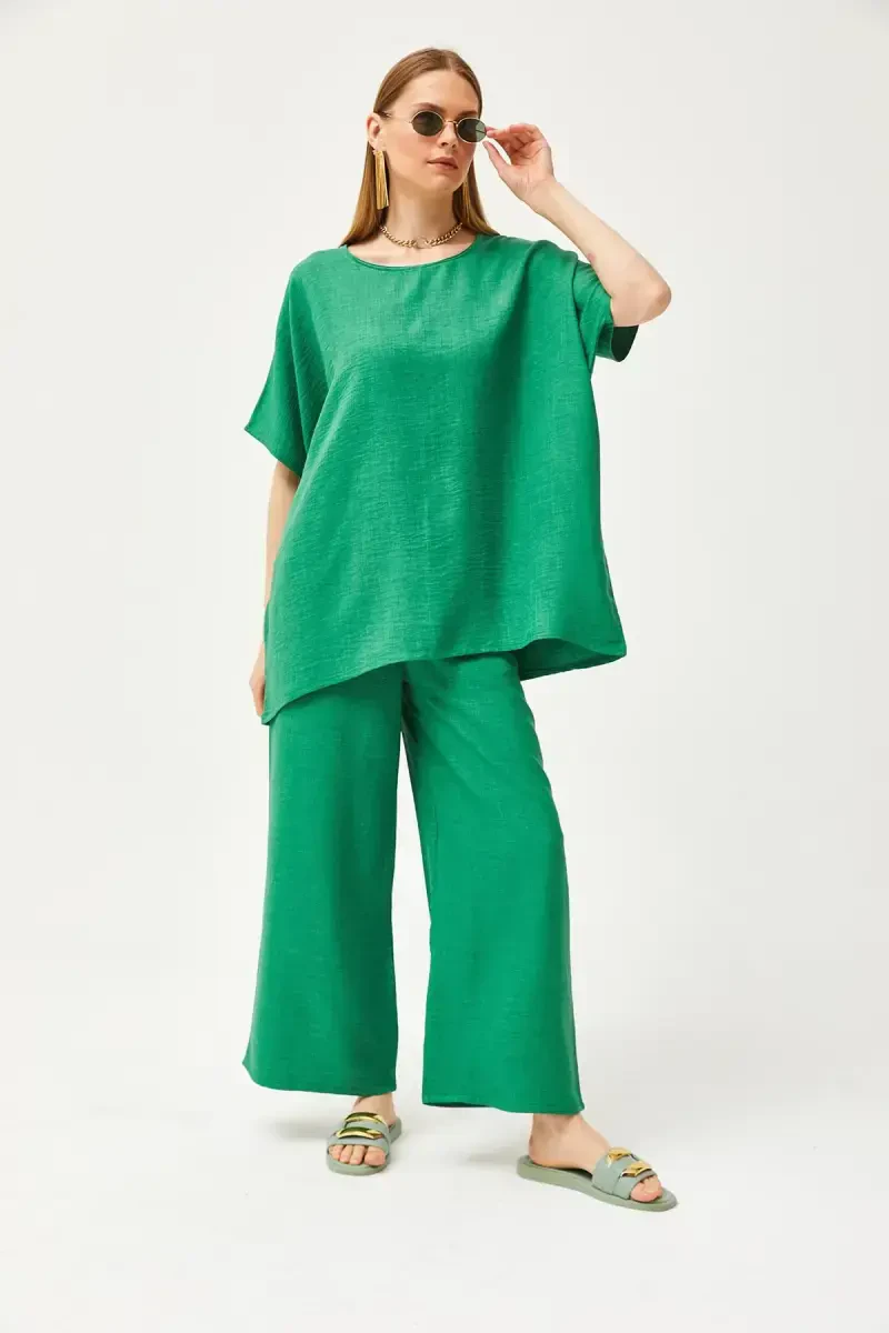 Kadın Yeşil Üst Salaş Bluz ve Alt Cepli Palazzo Keten takım, hem rahatlığı hem de şıklığı bir arada sunan, gardırobunuzun vazgeçilmez parçalarından biri olmaya aday. Bu özel tasarım, Trendyol güvencesiyle kapınıza kadar geliyor ve sizlere benzersiz bir deneyim yaşatmayı hedefliyor. İster günlük kullanımda, ister özel bir davette tercih edebileceğiniz bu kombin, stilinizi ön plana çıkaracak. Salaş bluz üstünün rahat kesimi, hareket özgürlüğünüzü kısıtlamadan şık görünmenizi sağlarken, cepli palazzo keten alt ise hem pratikliği hem de modern bir silueti beraberinde getiriyor.Bu kombin, %50 pamuk ve %50 keten karışımı kumaşı sayesinde nefes alabilen yapısıyla gün boyu konfor sunar. Özellikle sıcak havalarda terlemeyi önleyerek cildinizin rahat etmesine yardımcı olur. Ketenin doğal ve hafif dokusu, üzerinizde yokmuş hissi yaratırken, pamuk içeriği ise yumuşaklık ve dayanıklılık sağlar. Her yaş grubuna hitap eden geniş beden skalası sayesinde, vücut tipiniz ne olursa olsun kendinize uygun bir seçeneği kolayca bulabilirsiniz.Palazzo pantolonun normal bel tasarımı ve dar paça kesimi, modern bir siluet oluştururken, cepli detayları sayesinde telefon, anahtar gibi eşyalarınızı yanınızda taşıma kolaylığı sunar. Bisiklet yaka ve standart kol tipi ile tasarlanan bluz, sade ve zarif bir görünüm kazandırır. Düz deseni sayesinde farklı renk ve desenlerdeki alt giyimlerle kolayca kombinlenebilir, böylece gardırobunuzdaki diğer parçalarla uyum içinde kullanabilirsiniz.Bu özel kombin, sadece şık görünmekle kalmayıp aynı zamanda pratik bir kullanım da sunar. Yıkama talimatlarına uygun bakım ile uzun süreli kullanım için idealdir. Keten materyali sayesinde hafif ve doğal bir hissiyat verirken, dokuma kumaşı dayanıklılığı artırır. Gardırobunuzda hem şık hem de rahat bir seçeneğe sahip olmak istiyorsanız, Kadın Yeşil Üst Salaş Bluz ve Alt Cepli Palazzo Keten takımı kaçırmayın! Trendyol'un sunduğu bu eşsiz fırsatla, tarzınızı yansıtın ve konforun tadını çıkarın. Üstelik, memnun kalmadığınız takdirde 15 gün içinde ücretsiz iade imkanıyla risksiz bir alışveriş deneyimi yaşayabilirsiniz. Detaylı bilgi için Trendyol'un iade koşulları sayfasını ziyaret edebilirsiniz. Bu kombin, sizin için hem şıklığı hem de rahatlığı bir araya getiren mükemmel bir seçim olacaktır.