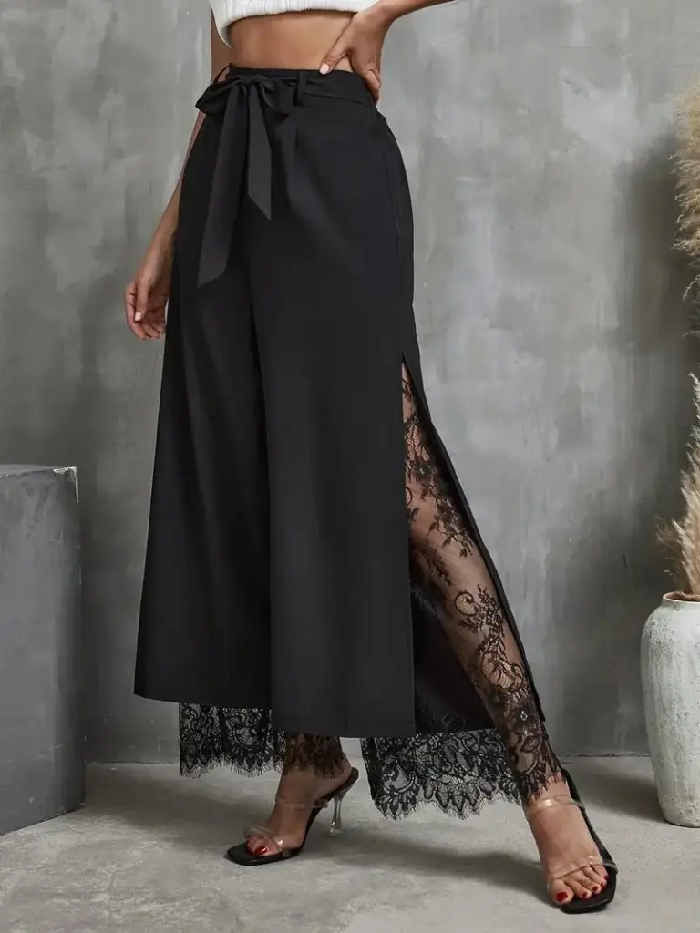 Kadın Yüksek Bel Belden Kuşaklı üst Dalgıç Alt Dantel Detaylı Dalgıç Pantolon