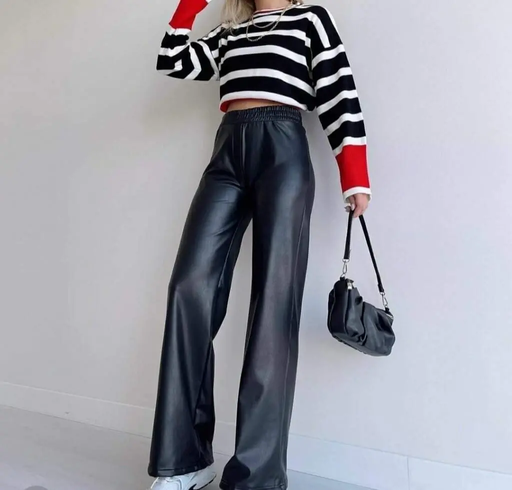 Kadın Yüksek Bel Beli Lastikli Geniş Paçalı Deri Pantolon ile stilinizi yeniden tanımlayın! Bu pantolon, modern ve şık görünümü bir araya getirerek gardırobunuzun vazgeçilmez bir parçası olmaya aday. Yüksek bel kesimi, vücut hatlarınızı kusursuz bir şekilde vurgularken, beli lastikli tasarımı gün boyu konforlu bir kullanım sunar. Geniş paça modeli, hareket özgürlüğünüzü kısıtlamaz ve aynı zamanda trend bir görünüm yaratmanıza yardımcı olur. Deri dokusu, pantolona lüks ve sofistike bir hava katar, böylece hem günlük kullanımda hem de özel davetlerde rahatlıkla tercih edebilirsiniz.Bu pantolon, farklı kombinasyonlarla kolayca uyum sağlayabilir. Günlük şıklık için basic bir tişört ve sneakerlarla kombinleyebilir, daha özel bir görünüm için ise şık bir bluz ve topuklu ayakkabılarla tamamlayabilirsiniz. Aksesuar seçimiyle de tarzınızı kişiselleştirebilirsiniz. Örneğin, büyük bir kemerle belinizi daha da vurgulayabilir veya minimalist bir kolye ile şıklığınızı tamamlayabilirsiniz.Modelin ölçüleri: Boy: 165 cm, Kilo: 55 kg, Göğüs: 90 cm, Bel: 72 cm, Kalça: 100 cm. Model üzerindeki ürün M/38 bedendir. Bu bilgiler, size uygun bedeni seçmenize yardımcı olacaktır. Pantolonun kesimi ve esnek yapısı sayesinde, farklı vücut tiplerine de kolaylıkla uyum sağlar.Kadın Yüksek Bel Beli Lastikli Geniş Paçalı Deri Pantolon, sadece şık değil, aynı zamanda pratik bir seçimdir. Yüksek kaliteli deri malzeme, uzun ömürlü bir kullanım sunar ve kolayca temizlenebilir. Gardırobunuzda uzun yıllar boyunca severek kullanacağınız, zamansız bir parçadır. İster gündüz ister gece, her ortamda stilinizi konuşturacak bu pantolonu kaçırmayın!