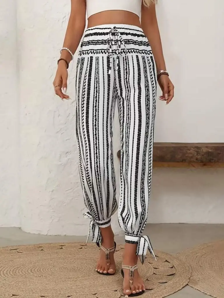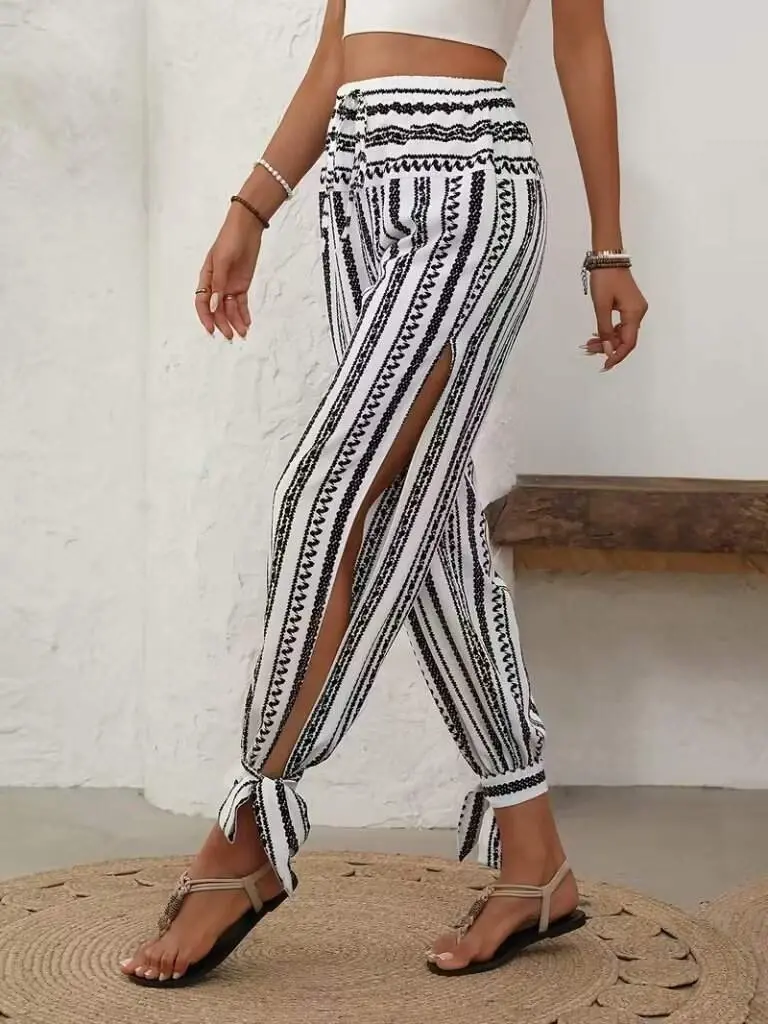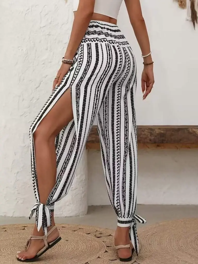 Kadın Yüksek Bel Desenli Paçadan Bağlamalı Yanları Yırtmaçlı Süprem Pantolon
