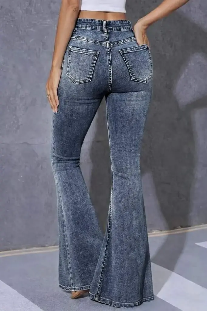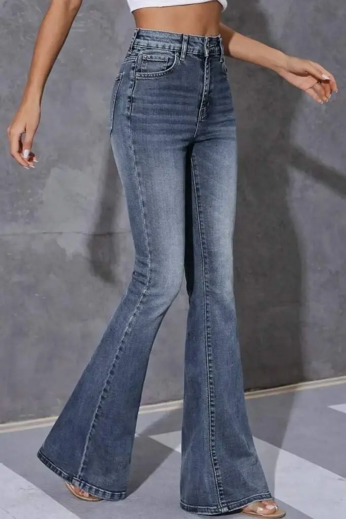 Kadın Yüksek Bel Fermuarlı İspanyol Paçalı Kot Pantolon