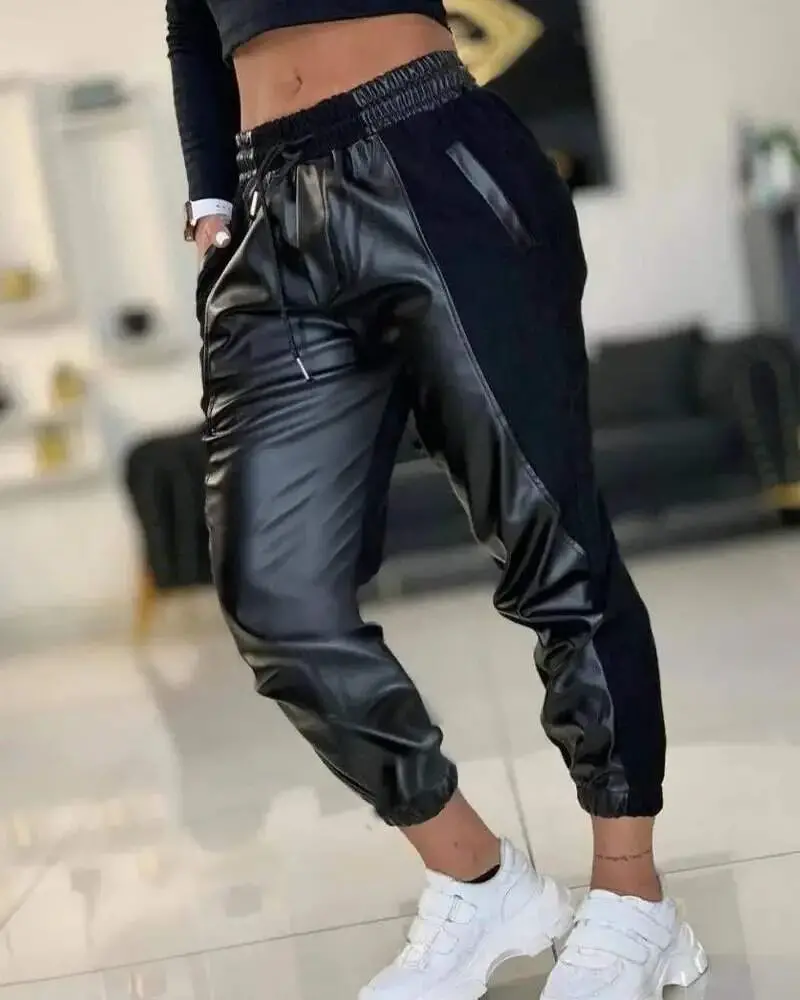 Kadın Yüksek Bel Lastikli Cepli Deri Detaylı Dalgıç Pantolon