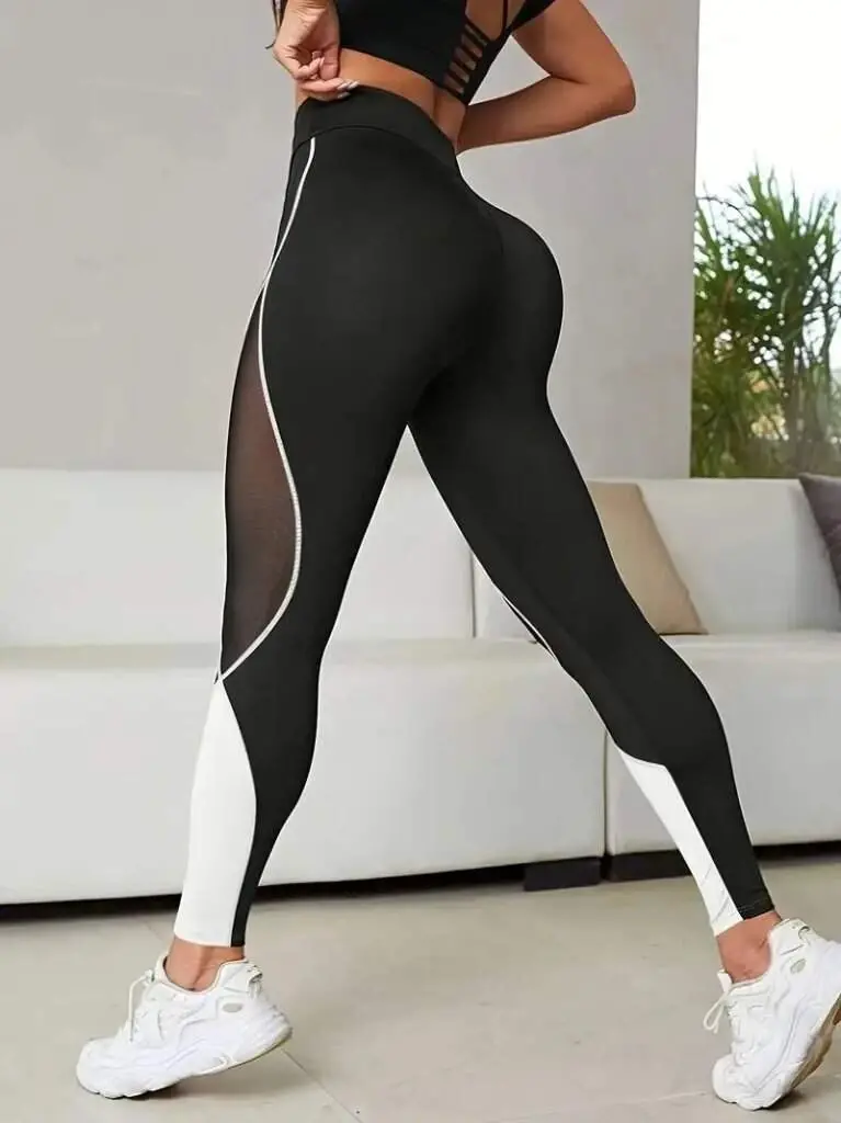 Kadın Yüksek Bel Yanlardan Tül Detaylı çift Renkli Spor Dalgıç Tayt
