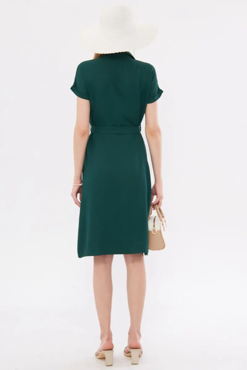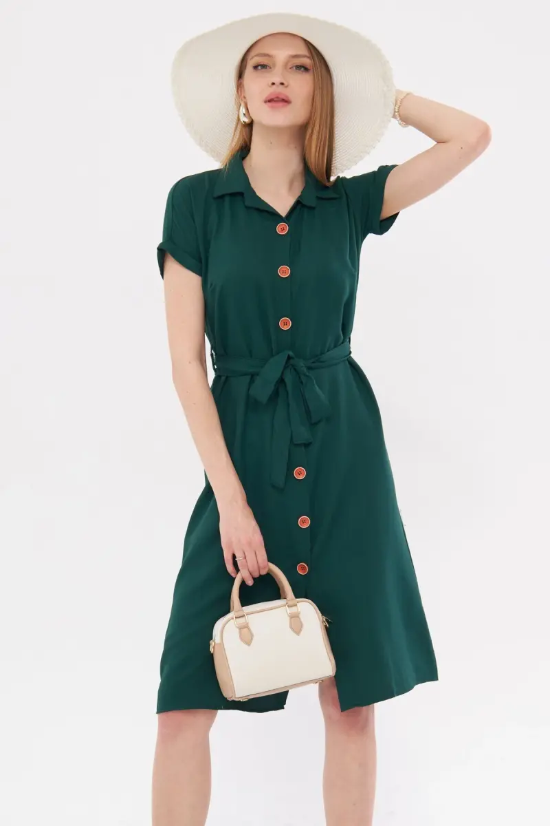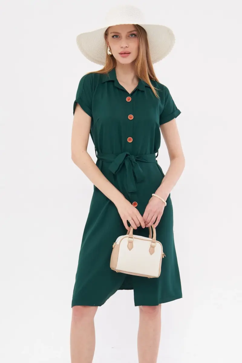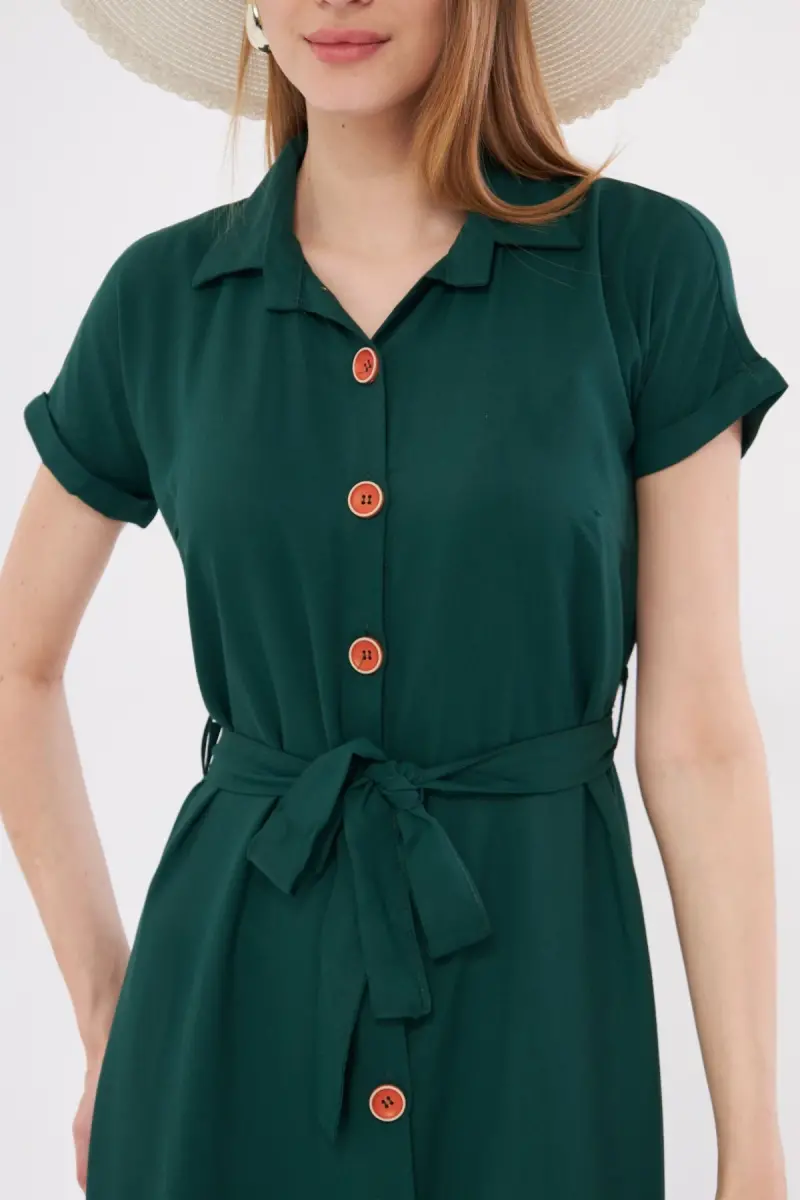 Kadın Zümrüt Beli Kemerli Kısa Kol Gömlek Elbise ARM-19Y001068-Zümrüt