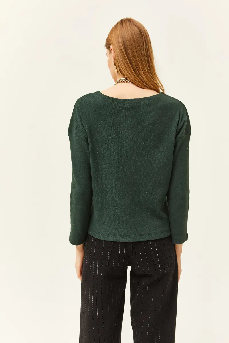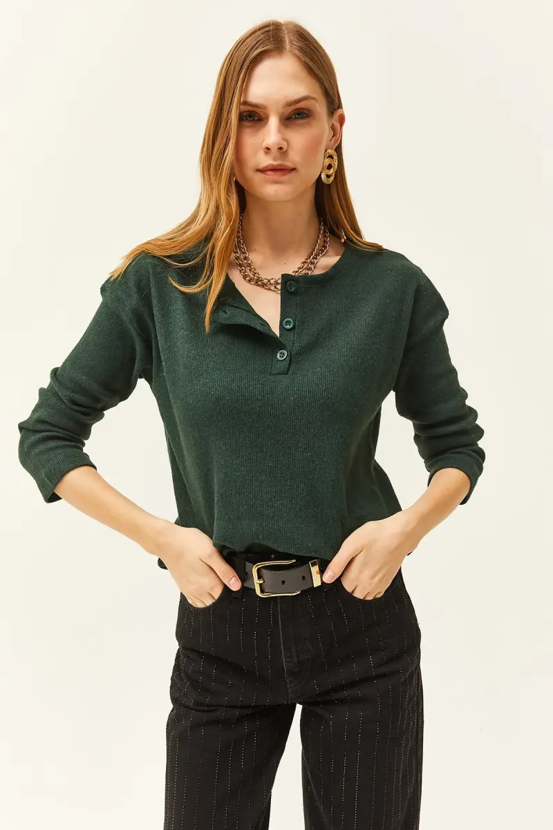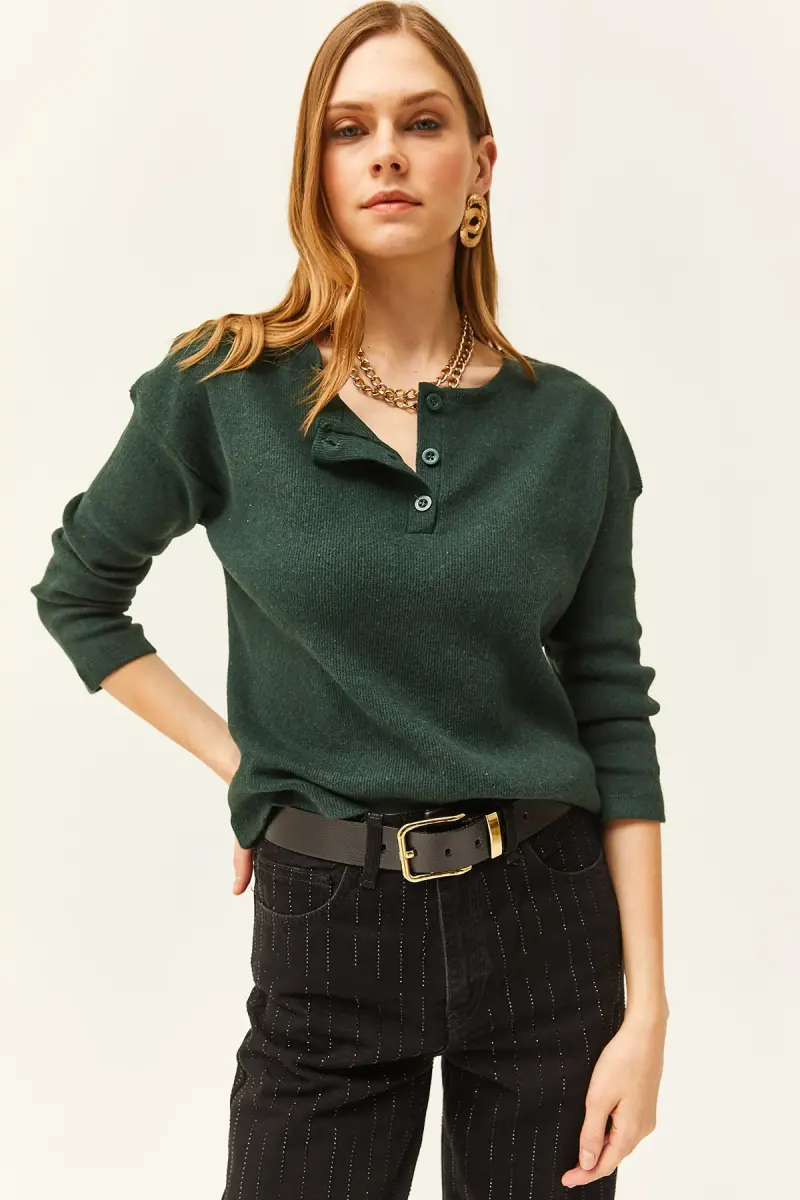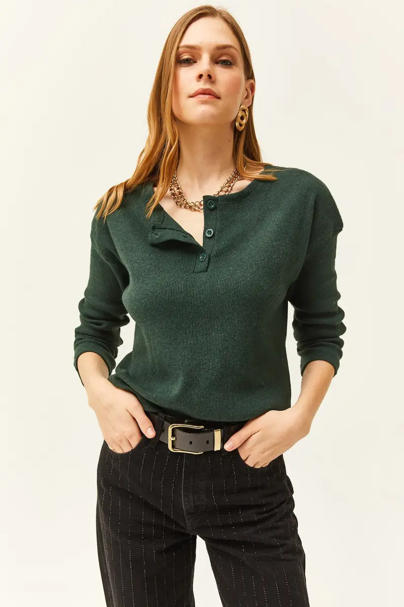 Kadın Zümrüt Yeşili Düğmeli Şardonlu Salaş Kazak KZK-19000721-Zümrüt Yeşili