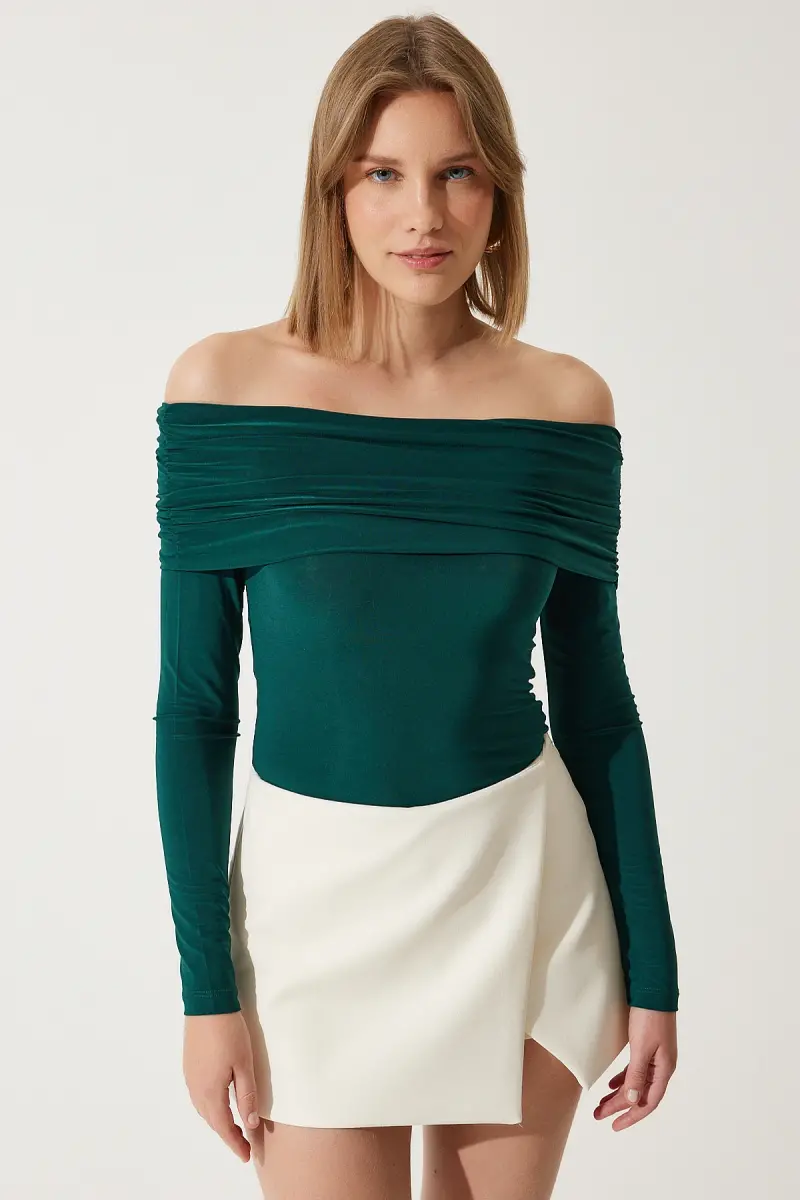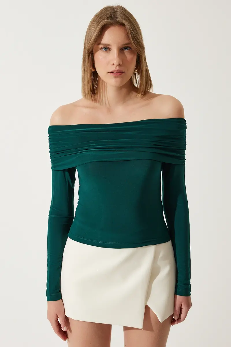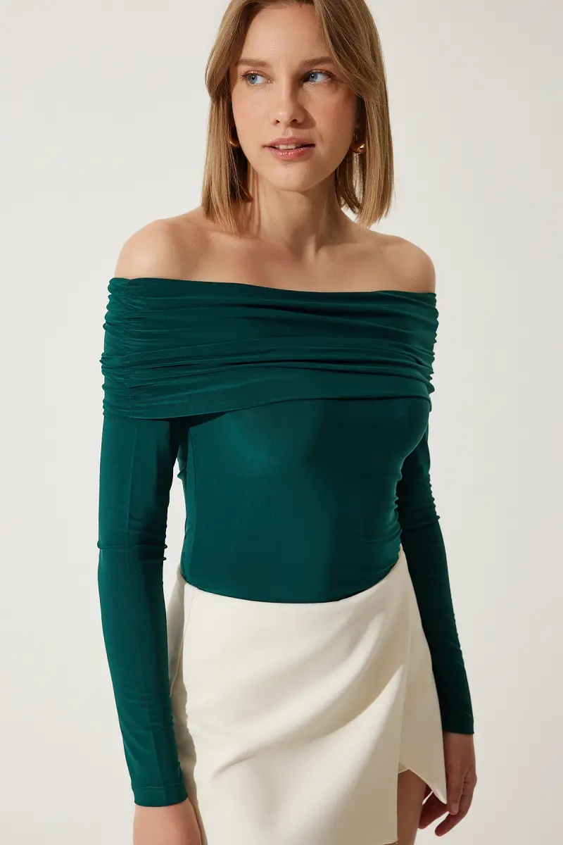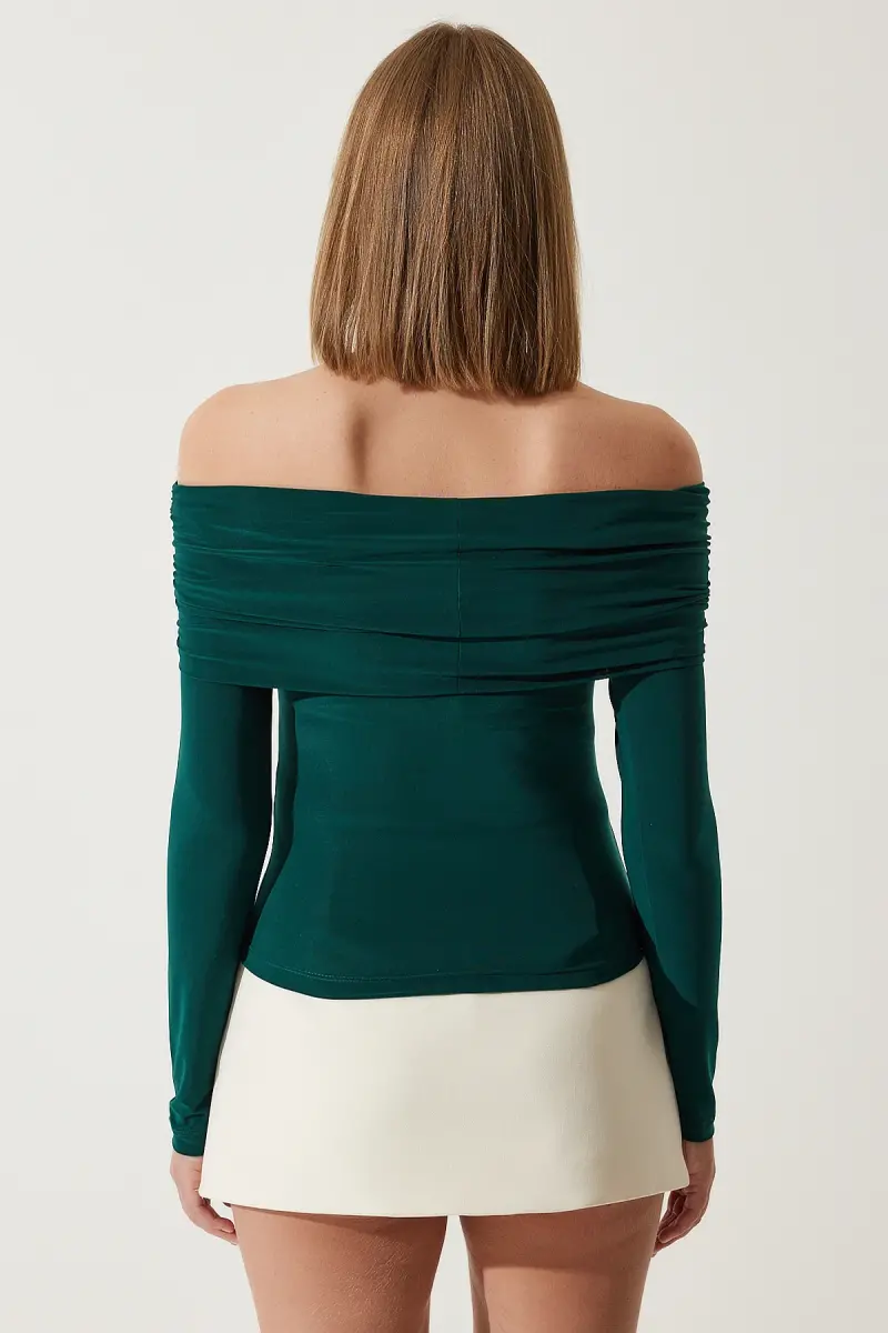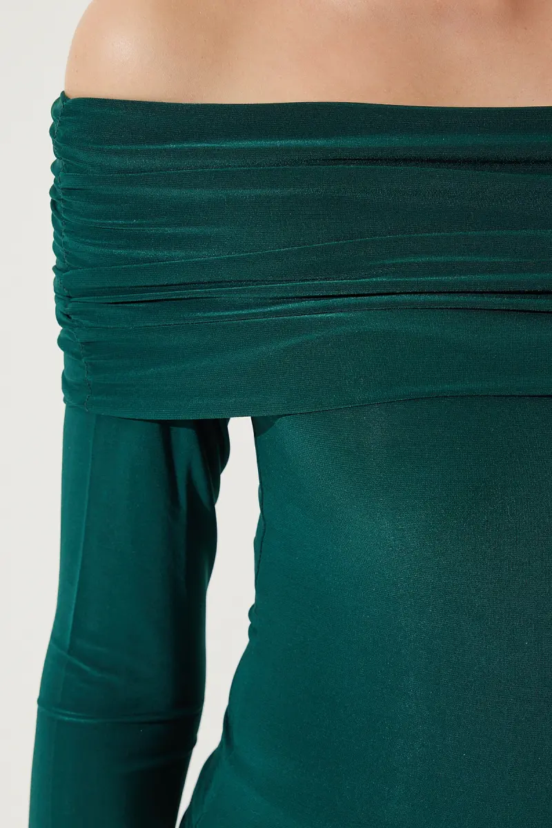 Kadın Zümrüt Yeşili Omuzları Açık Büzgü Detaylı Bluz FF00161-Zümrüt Yeşili