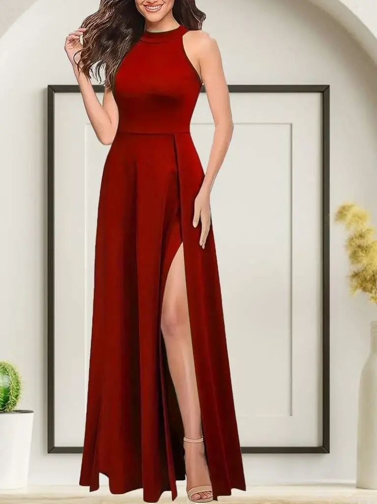 Kadınhalter Yaka Derin Yırtmaç Detaylı Tam Boy Ithal Krep Abiye ElbiseModelin Ölçüleri: Boy: 165, Kg: 55, Göğüs: 90, Bel: 72, Kalça: 100Modelin üzerindeki ürün M/38 bedendir