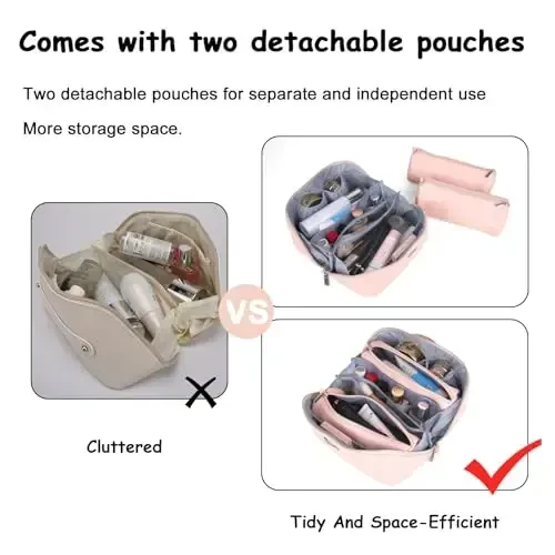 BOYATU Travel Makeup Bags for Women, seyahatlerinizde, iş gezilerinizde, tatillerinizde, açık hava etkinliklerinizde ve hatta pikniklerinizde makyaj malzemelerinizi düzenli ve şık bir şekilde taşımanız için tasarlanmış vegan deri kozmetik çantası setidir. Bu set, üç parçadan oluşmakta olup, içerisindeki iki adet çıkarılabilir makyaj çantası sayesinde cilt bakım ürünleriniz ve kozmetik malzemeleriniz için ideal bir düzenleme imkanı sunar. Yüksek kaliteli PU deriden üretilmiş olan bu kadın kozmetik çantası, dokunduğunuzda yumuşaklığını hissettirir, suya dayanıklıdır ve uzun ömürlüdür. Zarif görünümüyle size sayısız övgü getirecek olan BOYATU seyahat kozmetik çantası, sizin için harika bir seçim ve ideal bir yol arkadaşıdır. Geniş kapasitesi sayesinde, 230 ml'lik tonik şişelerini ve hatta daha büyük boyutlu ürünleri bile rahatlıkla alabilir. 9.25*5.1*5 inç boyutlarındaki bu makyaj çantası, sadece 0.75 LB ağırlığıyla hafif ve taşınması kolaydır. Kozmetiklerinizi ve tuvalet malzemelerinizi kolayca taşıyabilir, seyahat tuvalet çantası, preppy makyaj çantası, banyo çantası, kozmetik kutusu vb. olarak kullanılabilir. BOYATU makyaj çantası, zarif bir hediye kutusu ve düşünceli bir şekilde tasarlanmış tebrik kartı ile birlikte gelir. Sevgililer Günü, Anneler Günü, Doğum Günleri, Noel ve daha birçok özel gün için kadınlara harika bir hediye seçeneği sunar. Kir tutmaz ve su geçirmez özellikleriyle tasarlanmış olan bu makyaj seyahat çantası, ister makyaj masanızda, ister banyoda, ister açık havada, ister arabada veya bavulunuzda olsun, çeşitli ortamlara uygundur. Makyajınızı yapmak ve tazeleme ihtiyaçlarınızı karşılamak için her zaman yanınızda bulundurun.