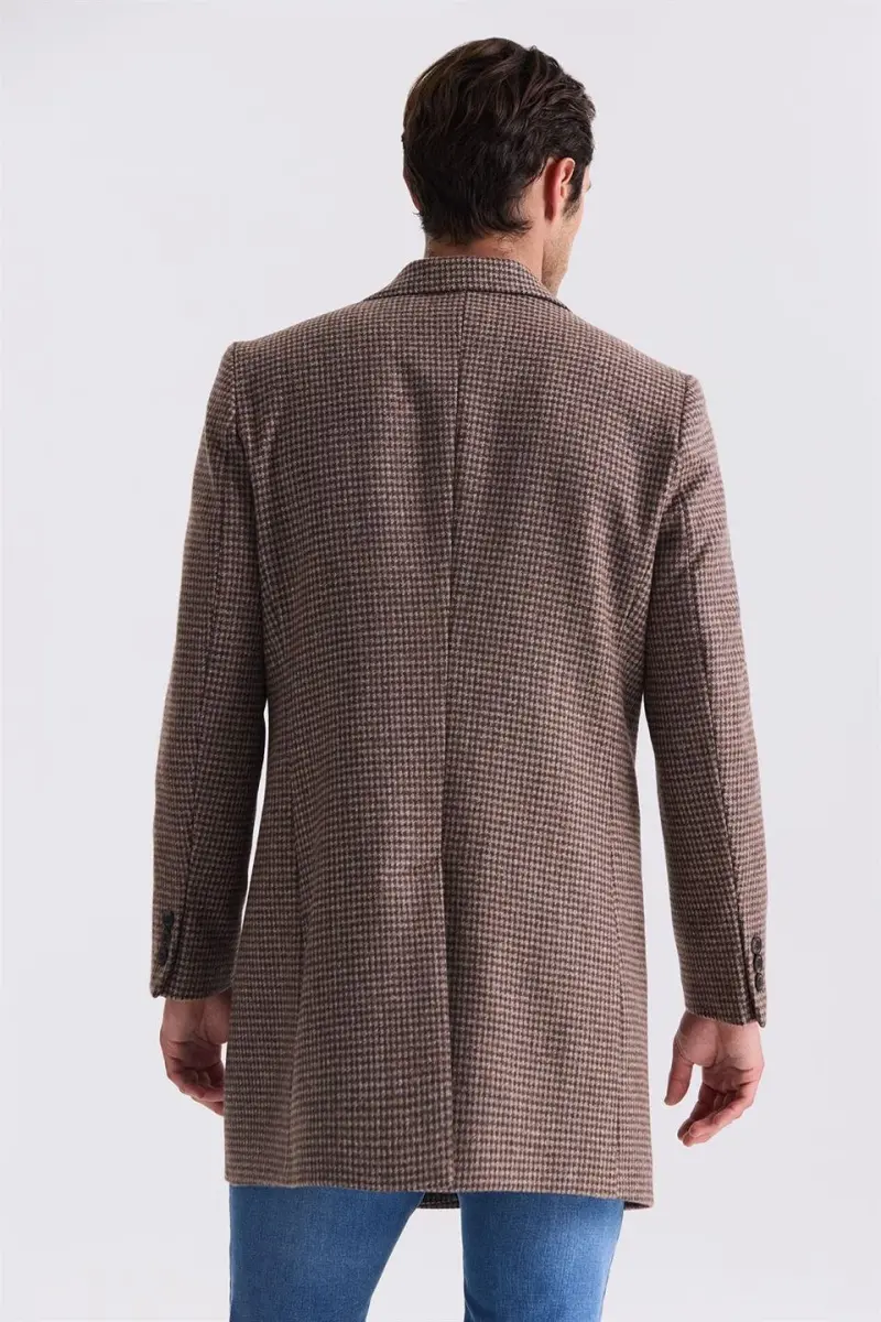 Kahve Comfort Fit Sivri Yaka Kareli Desenli Yünlü Kaşe Kaban