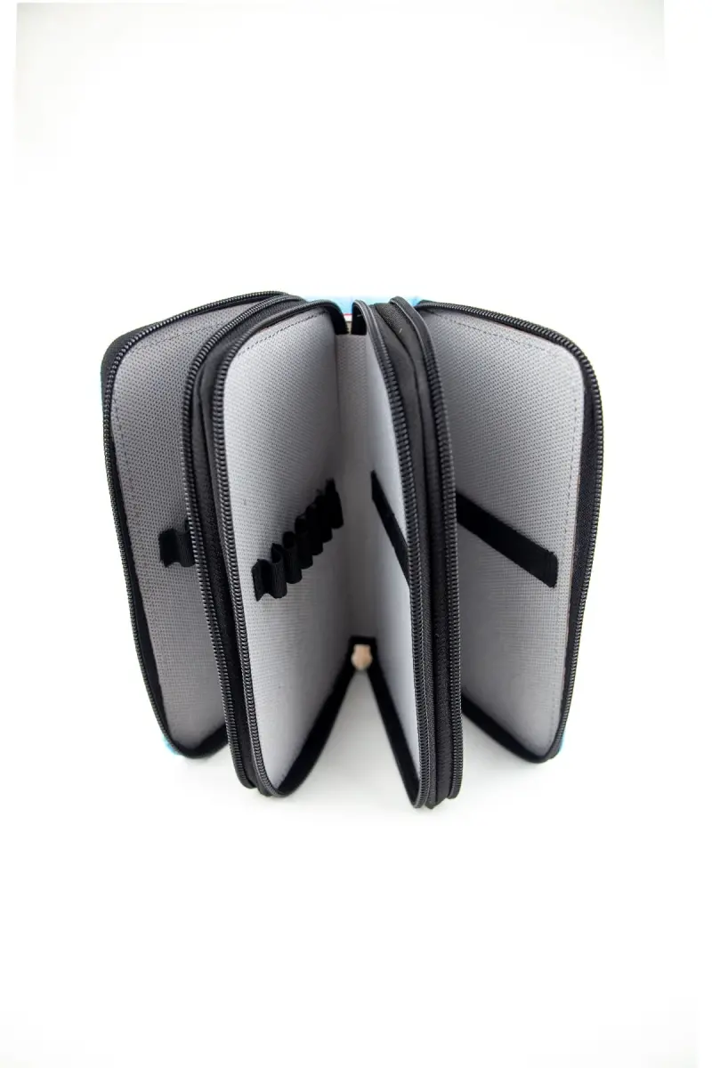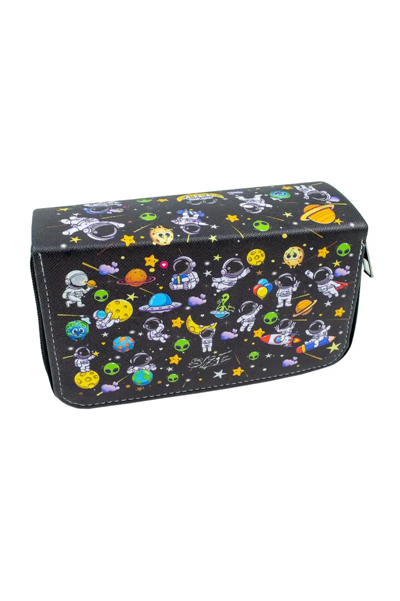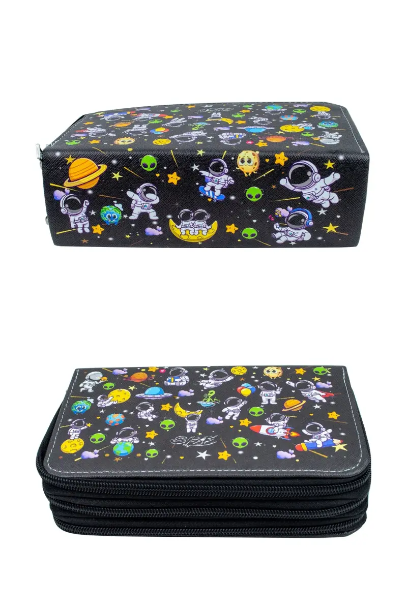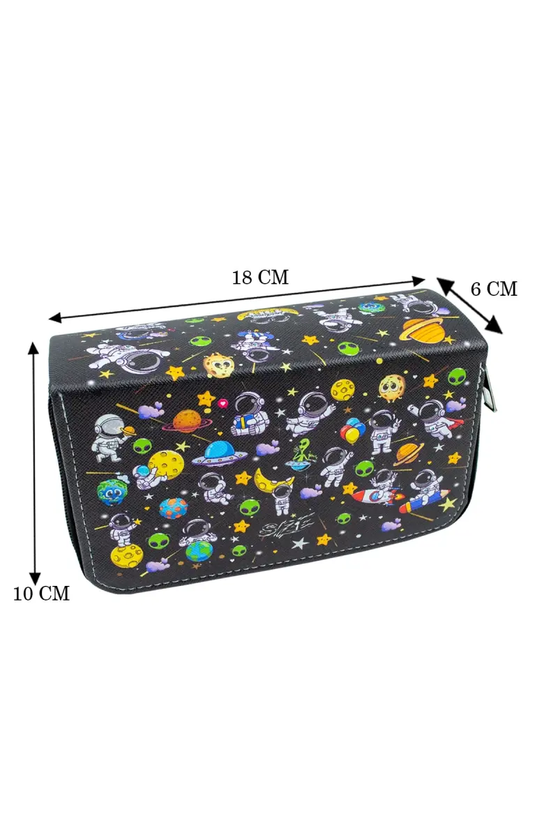 Kalem Kutusu Astronaut Kawaii Desen Orginazer Üç Bölmeli Vegan Deri (KALEMLİK)-Astronaut Siyah