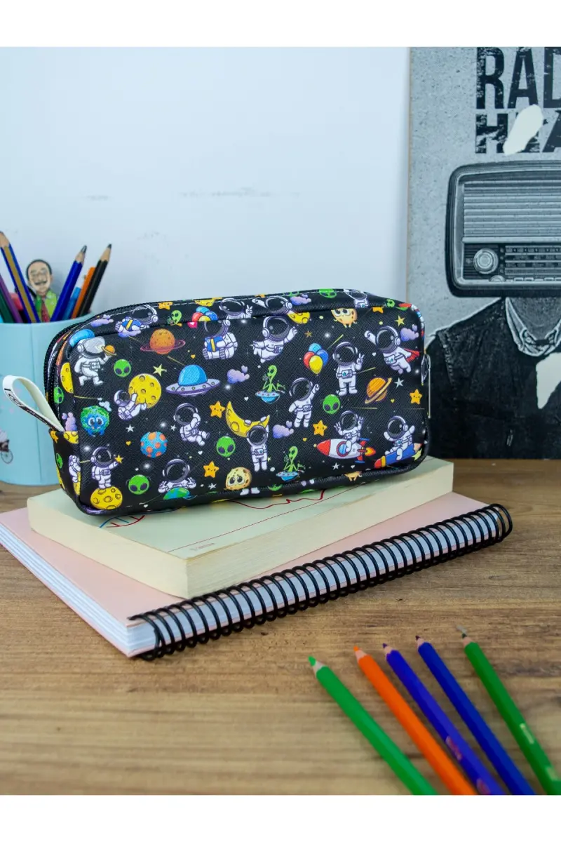 Kalem kutusu, astronot, vegan deri, çift bölmeli, kalemlik, çocuk, yetişkin, hediye, okul, ofis