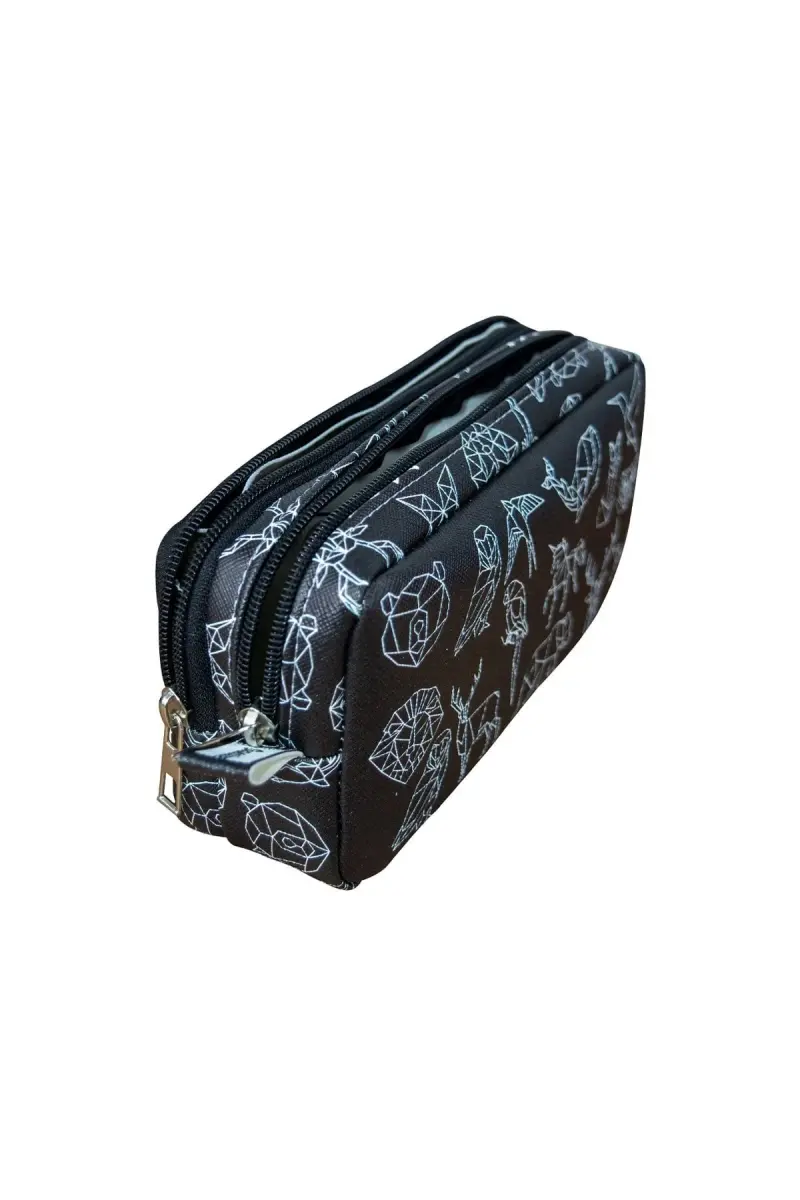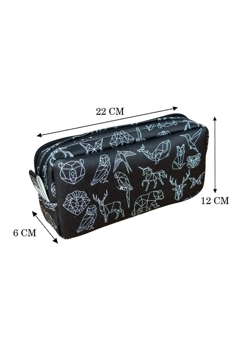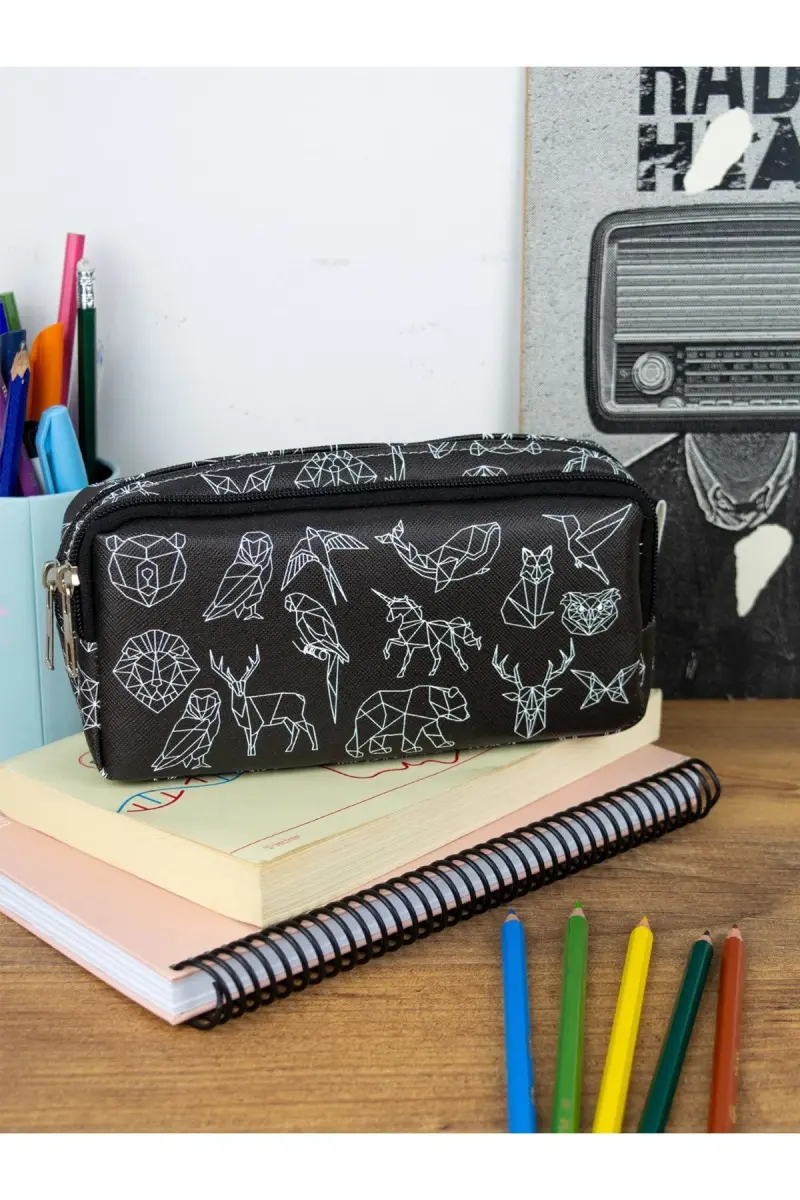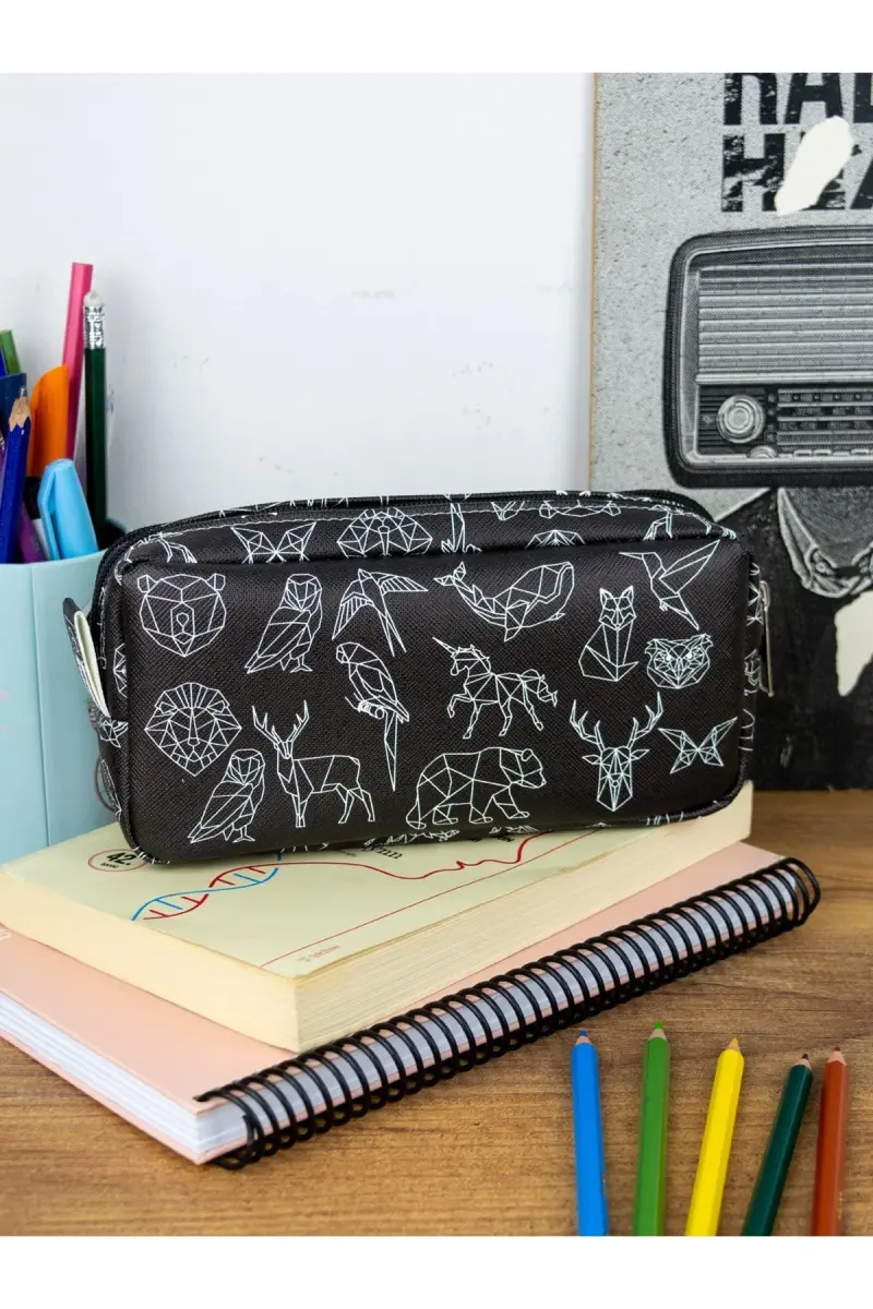 Kalem Kutusu Geometrik Hayvanlar İki Bölmeli Vegan Deri (çift Gözlü Kalemlik)-Geometrik Hayvanlar