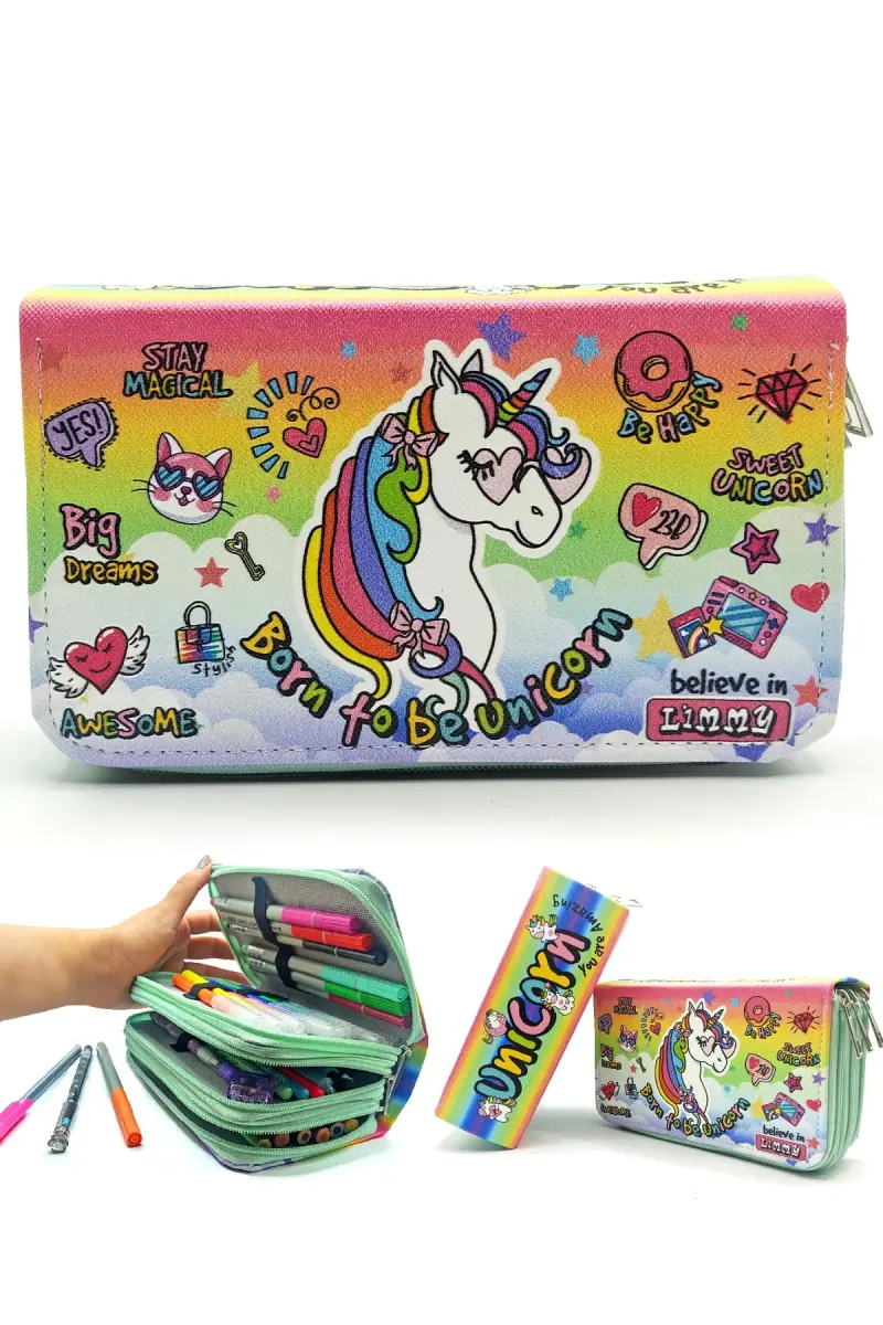 kalem kutusu, unicorn, kawai, organizer, vegan deri, okul, kırtasiye, yeşil, desenli, tarz