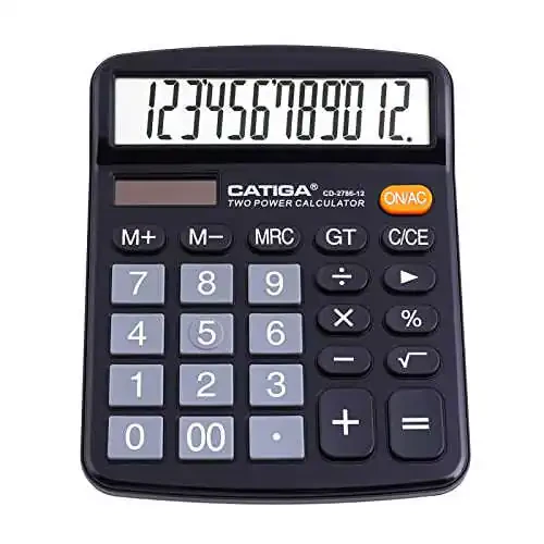 С настольным калькулятором CATIGA 12 Digits вы можете быстро и легко выполнять вычисления. Благодаря большому ЖК-дисплею вы можете легко считывать цифры даже на расстоянии. Его отзывчивые кнопки делают процесс набора текста быстрее и плавнее. Большой размер клавиш позволяет избежать нажатия не на ту клавишу. Настольный калькулятор CATIGA питается как от солнечной энергии, так и от батареи (батарея в комплекте). Солнечная панель будет питать калькулятор, пока вы используете его в освещенной среде. Он разработан для различных случаев, включая бизнес, офис, дом, базовый бюджет, школу и многое другое. Используйте его, чтобы управлять своими личными финансами или просто для быстрого сеанса расчетов. Настольный калькулятор CATIGA 12 Digits оснащен такими функциями, как сложение, вычитание, умножение, деление, возврат, общий итог, CE, %, M+/M-/MRC, кнопка включения/переменного тока и автоматическое выключение. Калькулятор выключится примерно через 6 минут простоя.