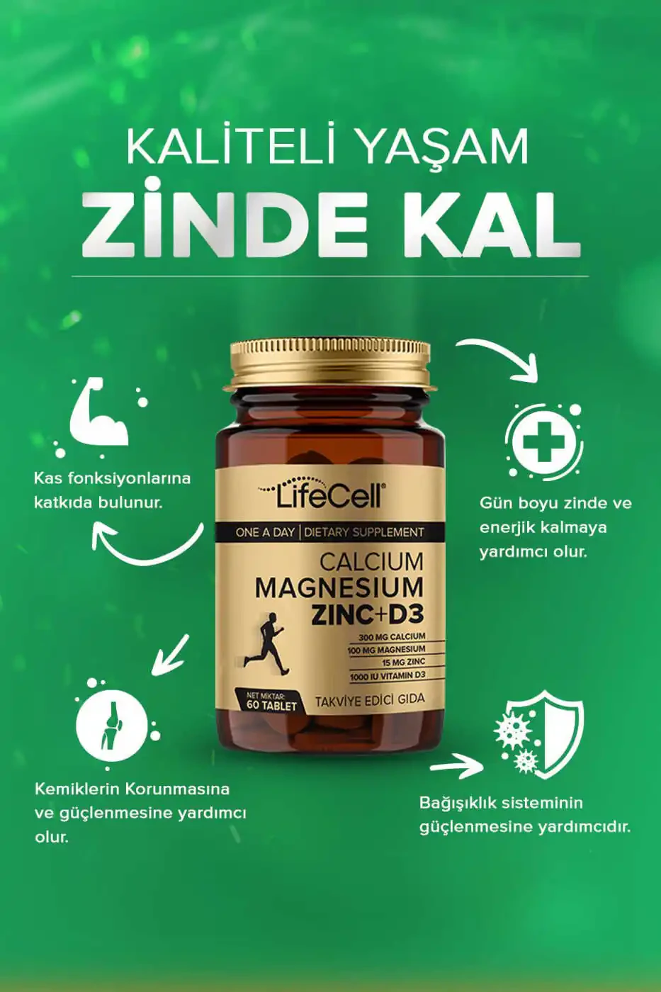 Kunlik kaltsiy, magniy, sink va D3 vitamini ehtiyojingizni bitta kapsulada olishni xohlaysizmi? Kaltsiy - Magniy - Sink - D3 suyak salomatligingizni, mushak faoliyatingizni va immunitet tizimingizni qo'llab-quvvatlash uchun ideal oziq-ovqat qo'shimchasi. Ayniqsa, shovqinli hayot tarzida, stressli muhitlarda va intensiv mashq qiladigan kishilar uchun mukammal qo'llab-quvvatlash hisoblanadi.