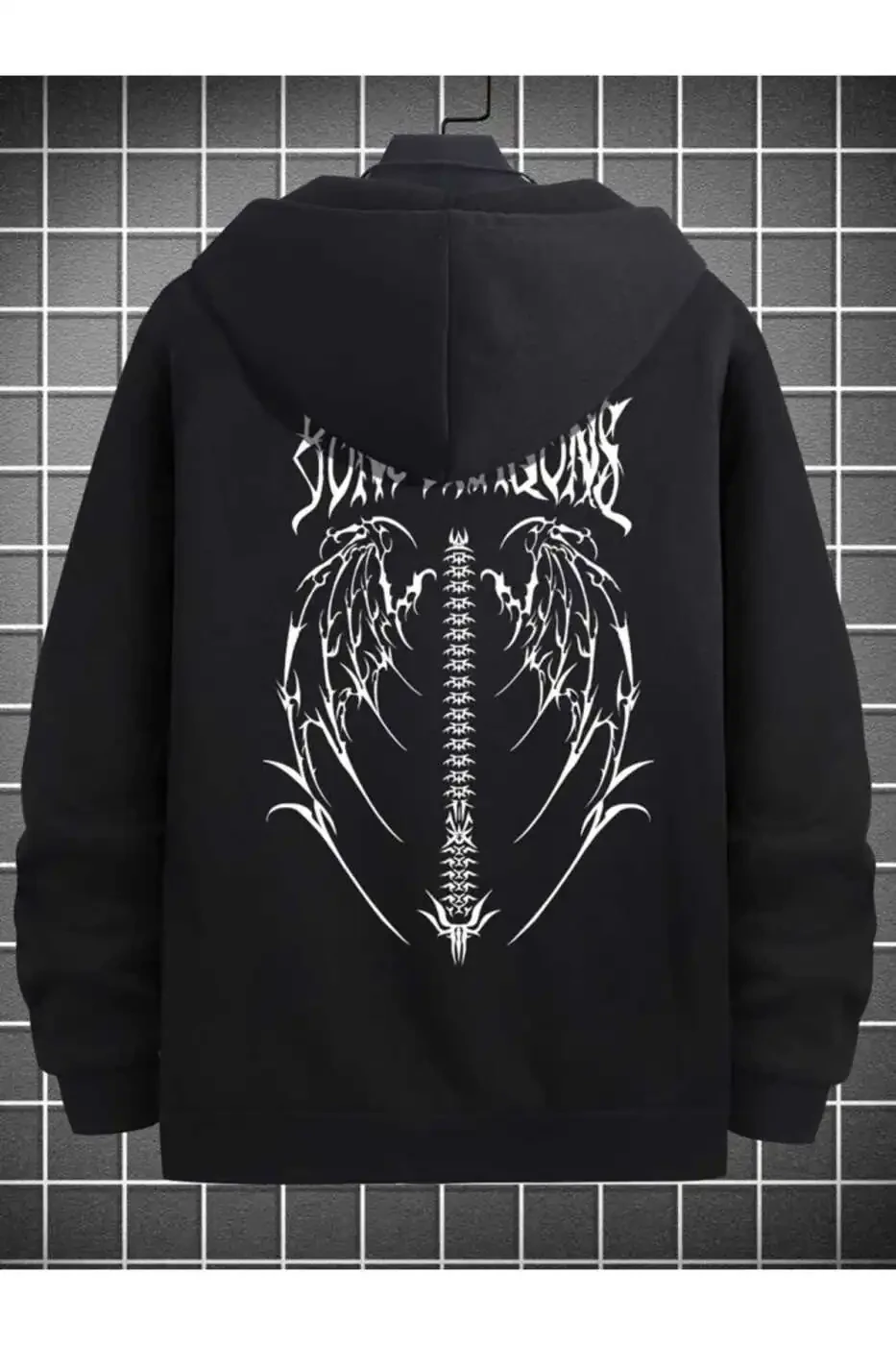 Свитшот с молнией с дизайном крыльев, идеальный выбор для того, чтобы быть теплым и стильным в холодные зимние дни, сочетает в себе комфорт и стиль. Этот свитшот с оверсайз-посадкой для удобной посадки отличается уникальным стилем благодаря черному принту в виде крыльев.