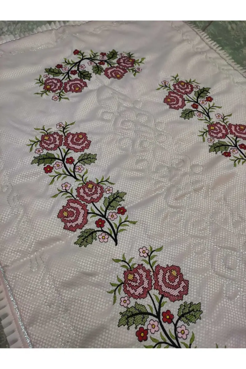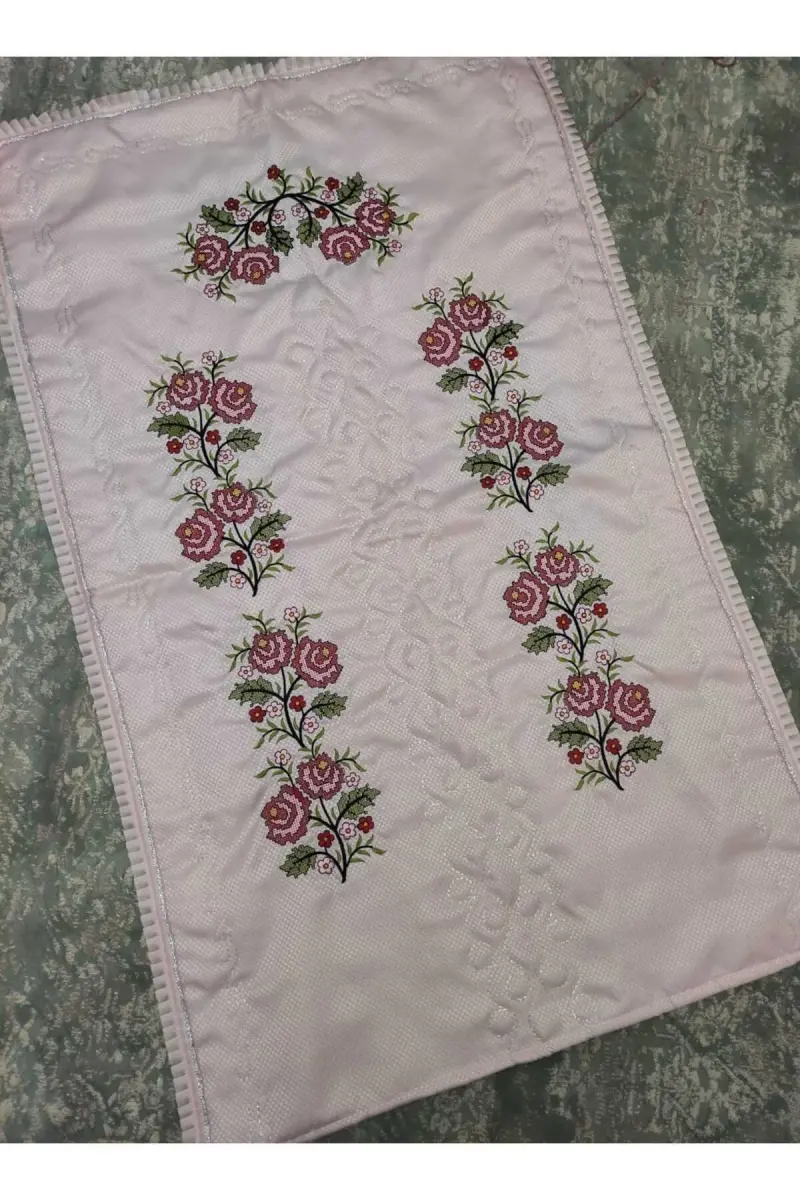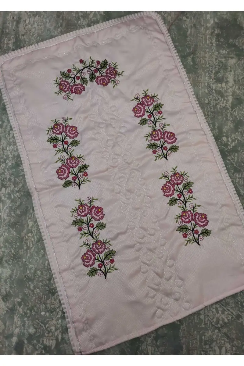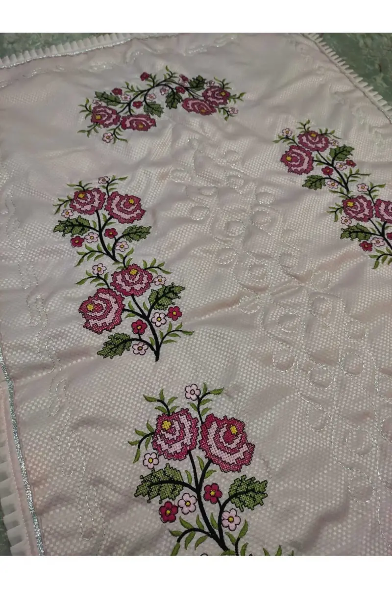 Kanaviçe Işlemeli Etamin Kumaş Tek Seccade - Pudra-Pudra