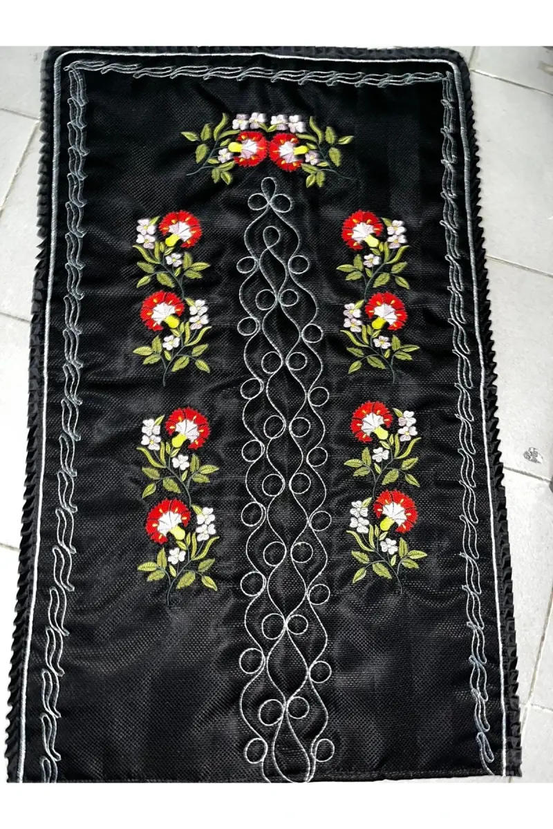 Kanaviçe Karanfil Işlemeli Etamin Kumaş Tek Seccade-Karanfil Siyaha Kırmızı Seccade