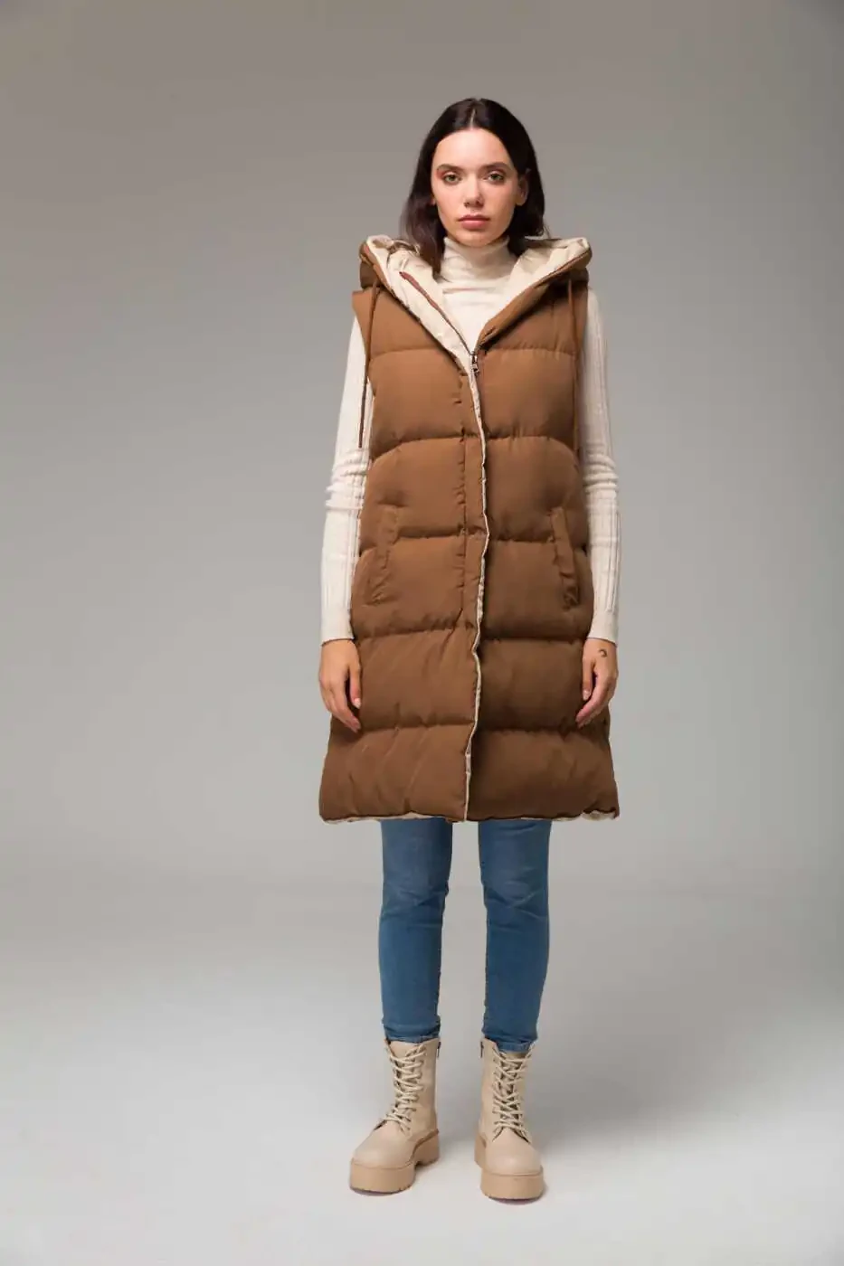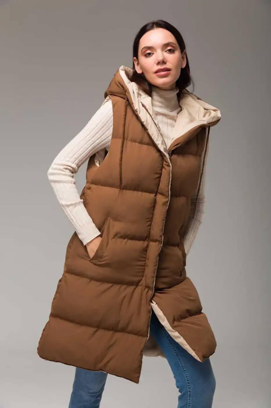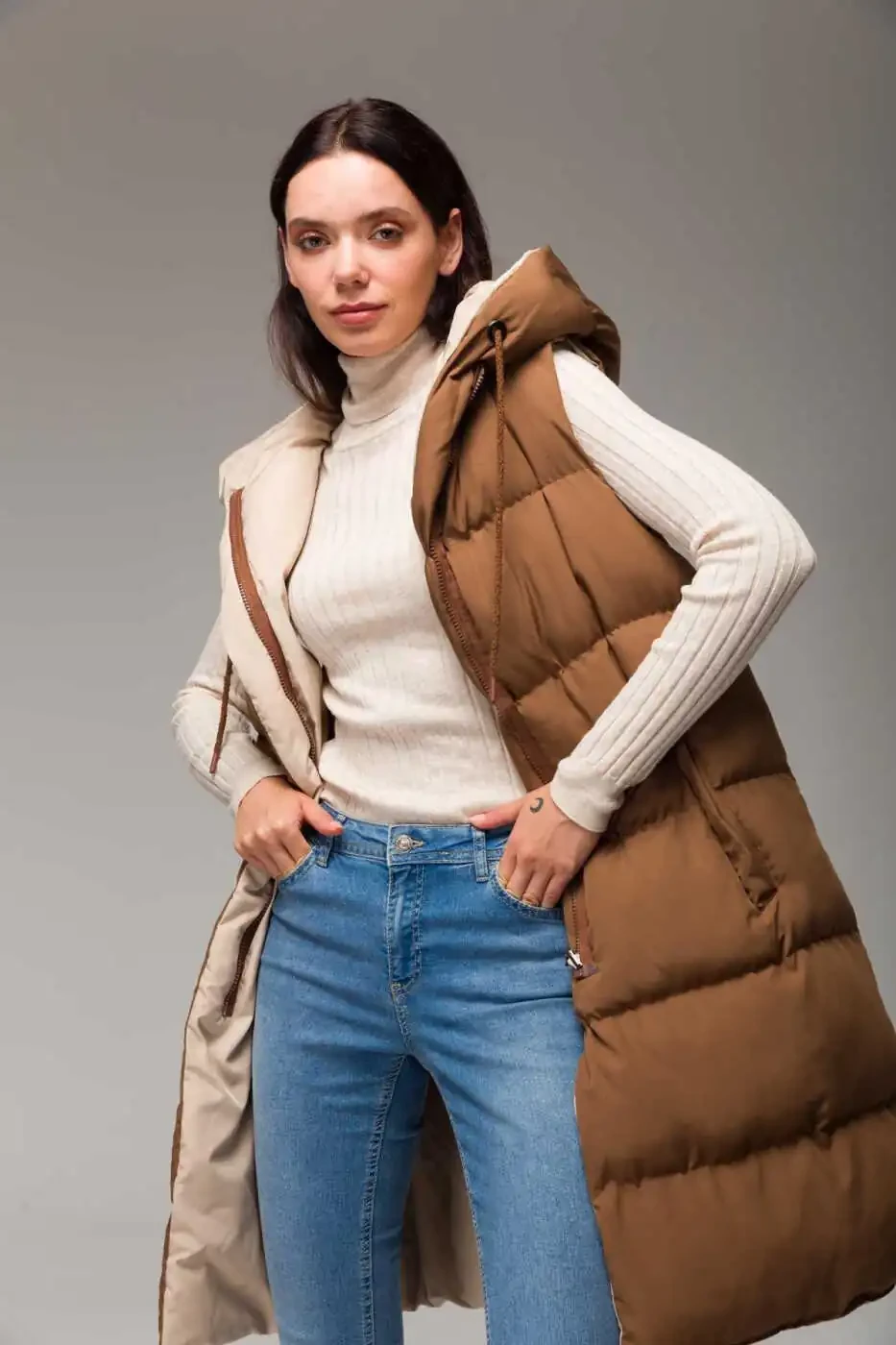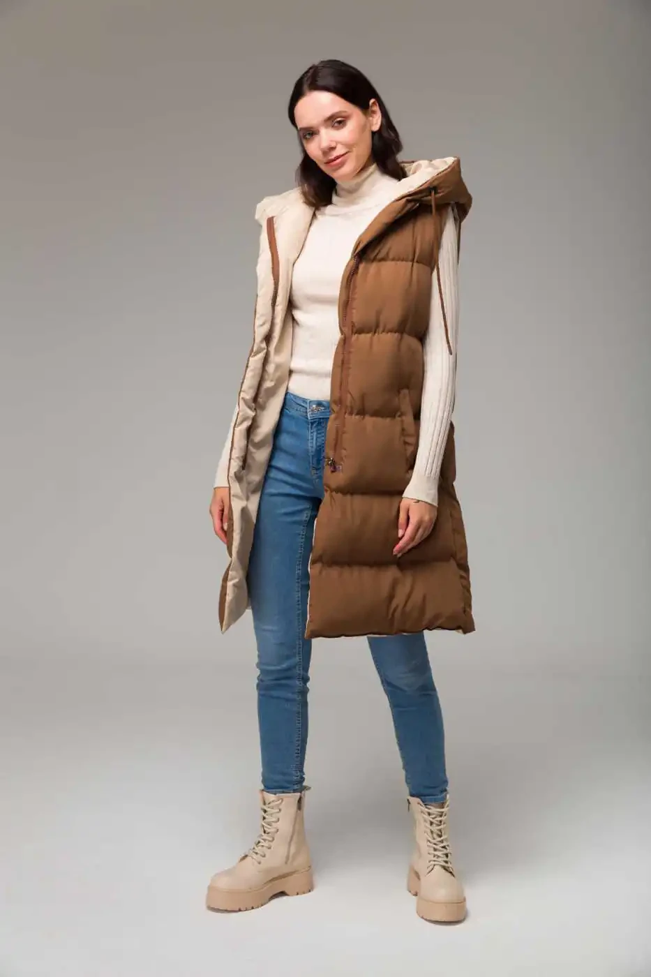 Идеальный выбор для того, чтобы выглядеть тепло и стильно в холодные зимние дни, пуховик-жилет с капюшоном двусторонний Табак-камень 8191! Сочетающий в себе стиль и функциональность, этот жилет дает вам свободу выражать свой стиль с двумя различными цветовыми вариантами. С одной стороны, модный табачный цвет, с другой, вневременной цвет камня, обеспечивающий стиль, подходящий для любой комбинации.