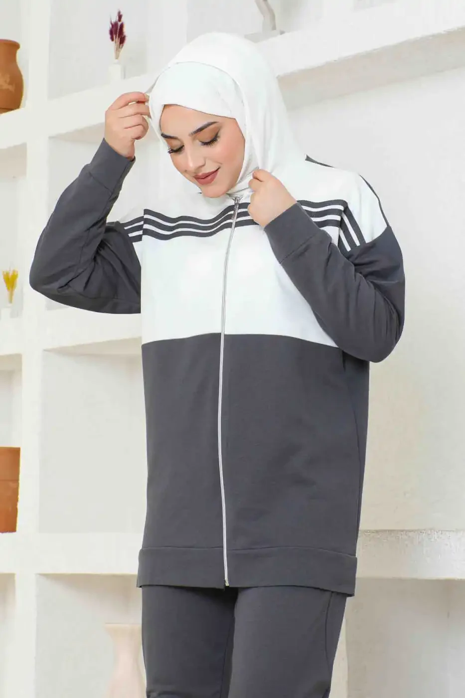 Kaputli Ikki Qismli Sport Kostyumi TRN1016 Tutun - Qulay va Zamonaviy
