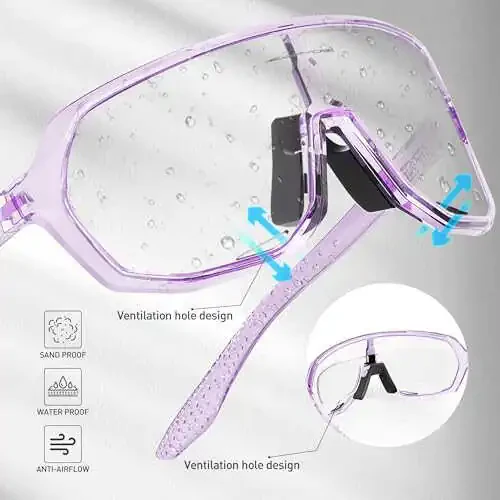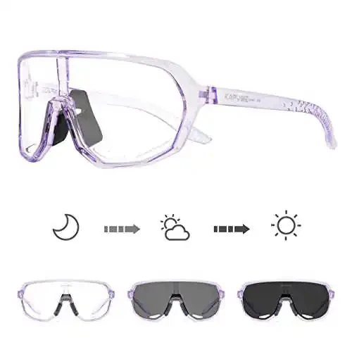 KAPVOE Foto-Xromatik Velosiped Ko'zoynaklari, kundalik foydalanish va velosipedda yurish, yugurish, baliq ovlash va sayr qilish kabi ochiq havoda o'tkaziladigan tadbirlar uchun mukammal tanlovdir. Linsalar quyosh nuriga ta'sir qilganda avtomatik ravishda qorayib ketadi va ko'zingizni zararli UV nurlanishidan himoya qiladi. Engil va qulay dizayni bilan ko'zoynak qulay kiyish tajribasini taqdim etadi. Ko'zoynak ramkasida yuz shaklingizga mukammal mos keladigan sozlanishi burun yostig'i ham mavjud.