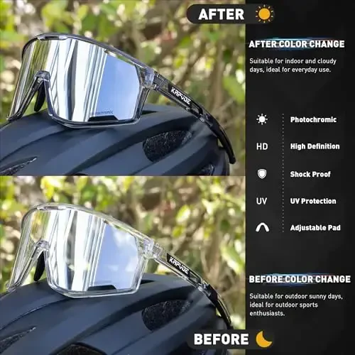 KAPVOE Photochromic Cycling Glasses K180 are designed for users who prioritize eye health while doing sports and also offer a stylish look. The glasses' photochromic lenses automatically change color according to the intensity of sunlight, providing optimum vision in different weather conditions. This feature offers a great advantage, especially when cycling, running, or doing other outdoor sports. In addition, the adjustable nose pad and lightweight TR90 frame provide maximum comfort even during long-term use. The glasses provide full protection against harmful sun rays thanks to UV400 protection, while providing long-lasting use thanks to impact and scratch-resistant polycarbonate lenses. The myopia frame specially designed for users with myopia offers the possibility to personalize the glasses. KAPVOE K180 is not only a sports glasses, but also a tool that protects your eye health and increases your performance. It is an ideal choice for anyone who wants to be both comfortable and safe while doing sports. In addition, thanks to the comprehensive protection plan offered, you are also protected against possible damages that may occur to your glasses. This plan aims to maximize user satisfaction by offering repair, replacement or gift card options.