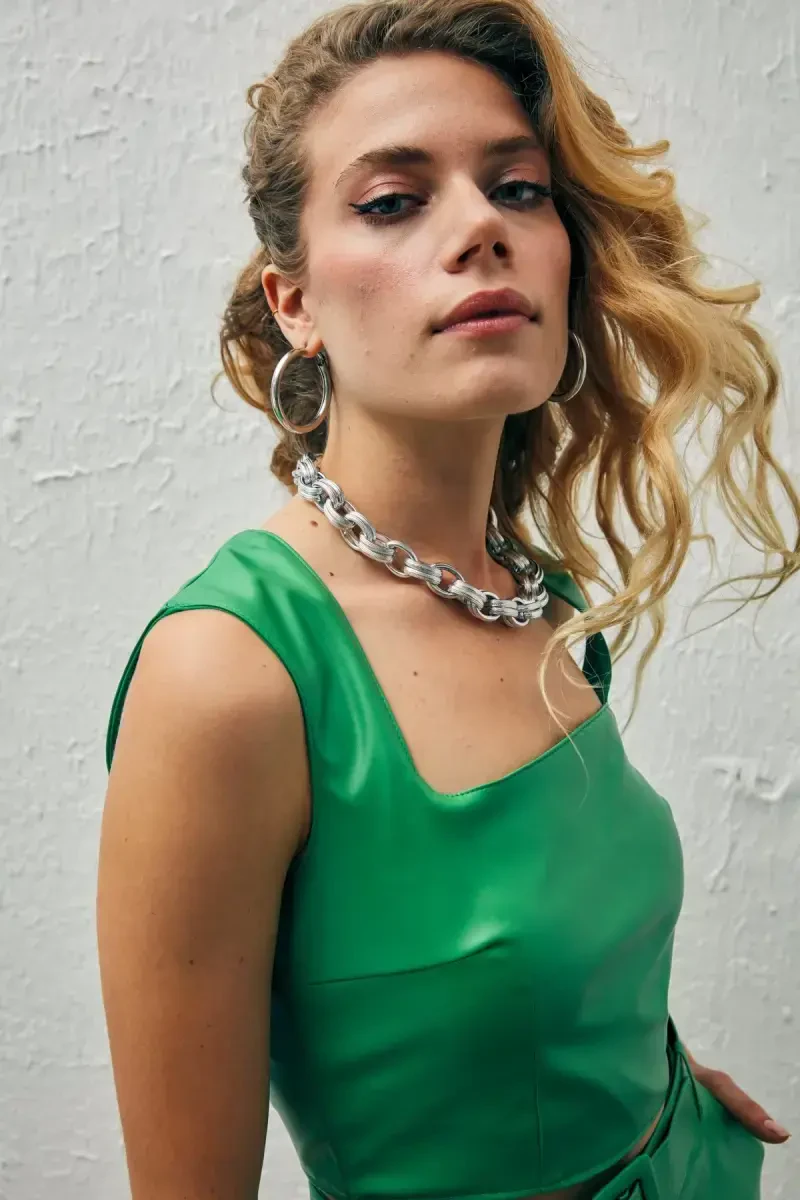 The Square Neck Leather Crop Top is a must-have for any wardrobe looking for a stylish and bold look. Made with soft and durable leather, this top fits your body perfectly and gracefully hugs your curves. The square neckline detail makes your neck look longer and more elegant, while the crop model accentuates your waist, creating a feminine silhouette. The green color will make you stand out from the crowd. From everyday outfits to evening events, the Square Neck Leather Crop Top can be easily worn everywhere, highlighting your style and sophistication.