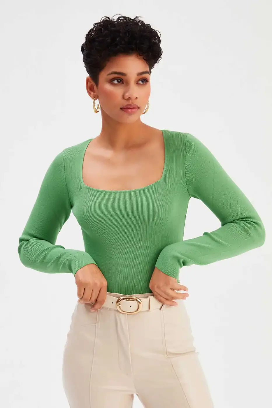 Kvadrat yaka o'tkir va zamonaviy ko'rinish beradi, xolos qulay kesim va yumshoq to'qima kun bo'yi qulay foydalanishni ta'minlaydi. Yashil rangi har qanday uslubga mos keladigan bu triko, jinsi shimlar, yubkalar, mato shimlar va hatto shortilar bilan ajoyib tarzda birlashtiriladi.