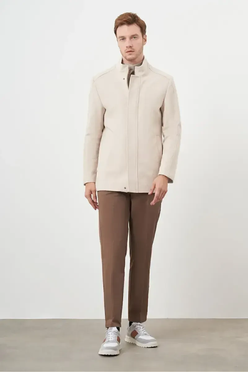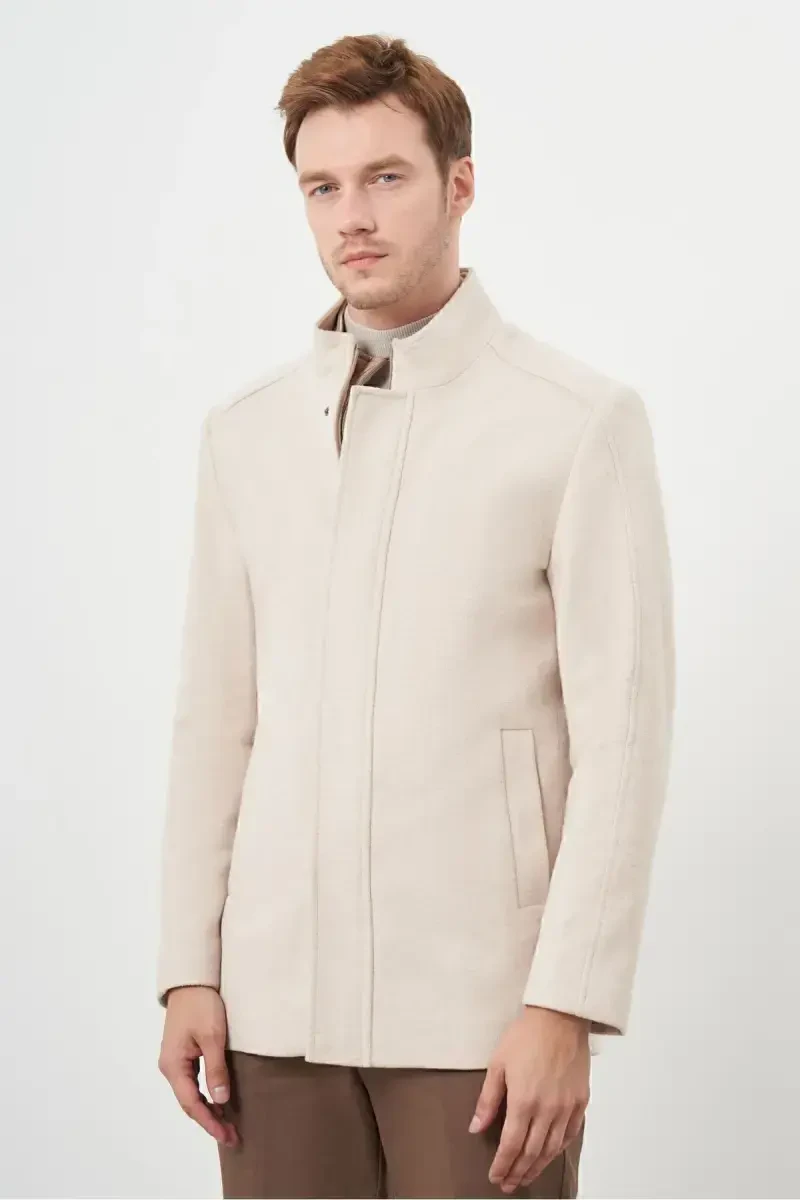 Купите мужское бежевое шерстяное пальто с воротником-стойкой на кнопках и наслаждайтесь стилем и теплом одновременно!