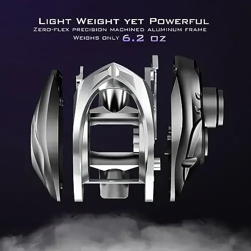 The KastKing MegaJaws Elite Baitcasting reel is a high-performance product with superior features designed to take your fishing experience to the next level. Thanks to its patented AMB (Auto-Adjustment Magnetic Braking) system, it minimizes backlash, offering a reel that anglers of all levels, from beginners to professionals, can use with confidence. This system automatically adjusts to the spool speed, allowing you to make longer and more controlled casts. With its lightweight and durable construction, the MegaJaws Elite, weighing only 6.4oz, is resistant to harsh conditions thanks to its CNC machined aluminum frame and carbon fiber side covers. Its ergonomic 41mm design offers comfortable use even during long fishing sessions. The product features a flipping switch specifically designed for flipping and pitching techniques. This feature allows you to release the line by pressing it with your thumb and stop it when you release it. It is also perfect for various applications such as bottom fishing for saltwater fishing or bait dragging for freshwater fishing. The KastKing LFTV (Low Friction Tapered Vortex) line guide increases casting distance and minimizes backlash by reducing line friction with its unique funnel-shaped ceramic design. This allows you to make more efficient and controlled casts. MegaJaws Elite is a marvel of precision engineering with DigiCut 7075 aluminum main gears and manganese brass pinion gears. 7.2 and 9.1 gear ratios achieve faster spool speeds thanks to the short main shaft and spool bearings. The 17.6 lb triple carbon disc drag system delivers powerful and reliable braking performance. Thanks to superior protection plans, your product is guaranteed against drops, exposure to liquids, and screen cracks from the date of purchase. Additionally, failures that occur after the manufacturer's warranty expires are also covered. You can easily create a request online or by phone, and most requests are approved within minutes. You can take advantage of repair, replacement, or refund options up to the purchase price of the product. In short, the KastKing MegaJaws Elite is a baitcasting reel that combines performance, durability and ease of use, and that every angler will want to own.