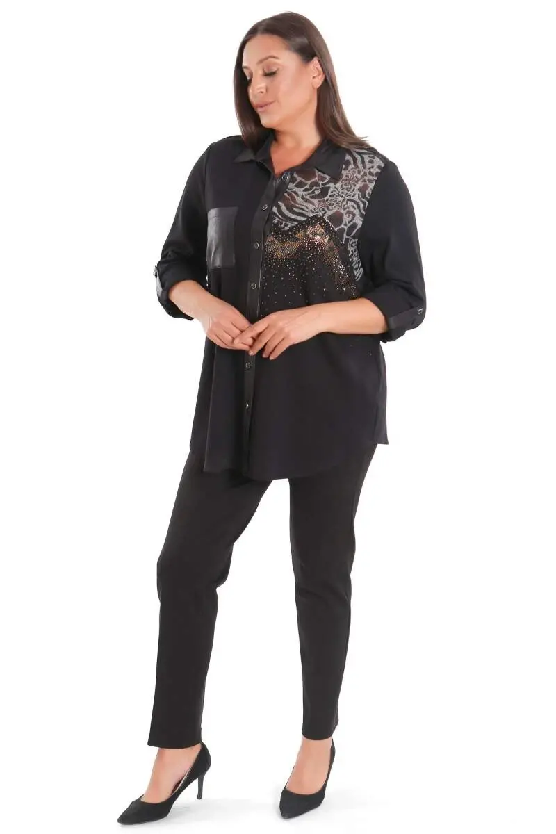 Katta o'lchamli tosh bosma charm cho'ntakli qora ko'ylak