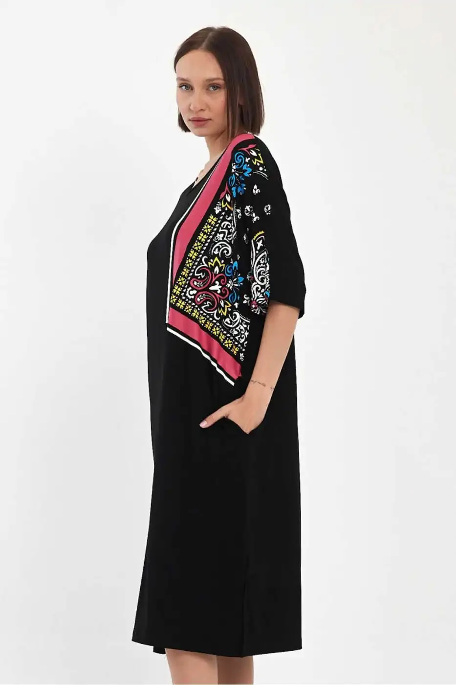 Plyus o‘lchamli Etnik Truvakar Yarasa Yengli Klassik Bo‘sh Viskon Ko‘ylak, Yelka Naqshli