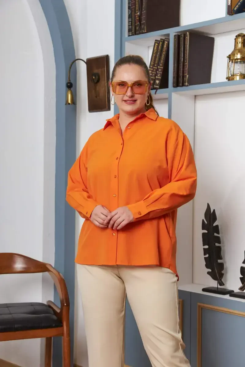 Katta o'lchamdagi ko'ylak, keng ko'ylak, uzun yengli ko'ylak, to'q sariq ko'ylak, qulay ko'ylak, ayollar ko'ylagi, zamonaviy ko'ylak, katta o'lchamdagi ayollar, keng bichim, to'q sariq rang