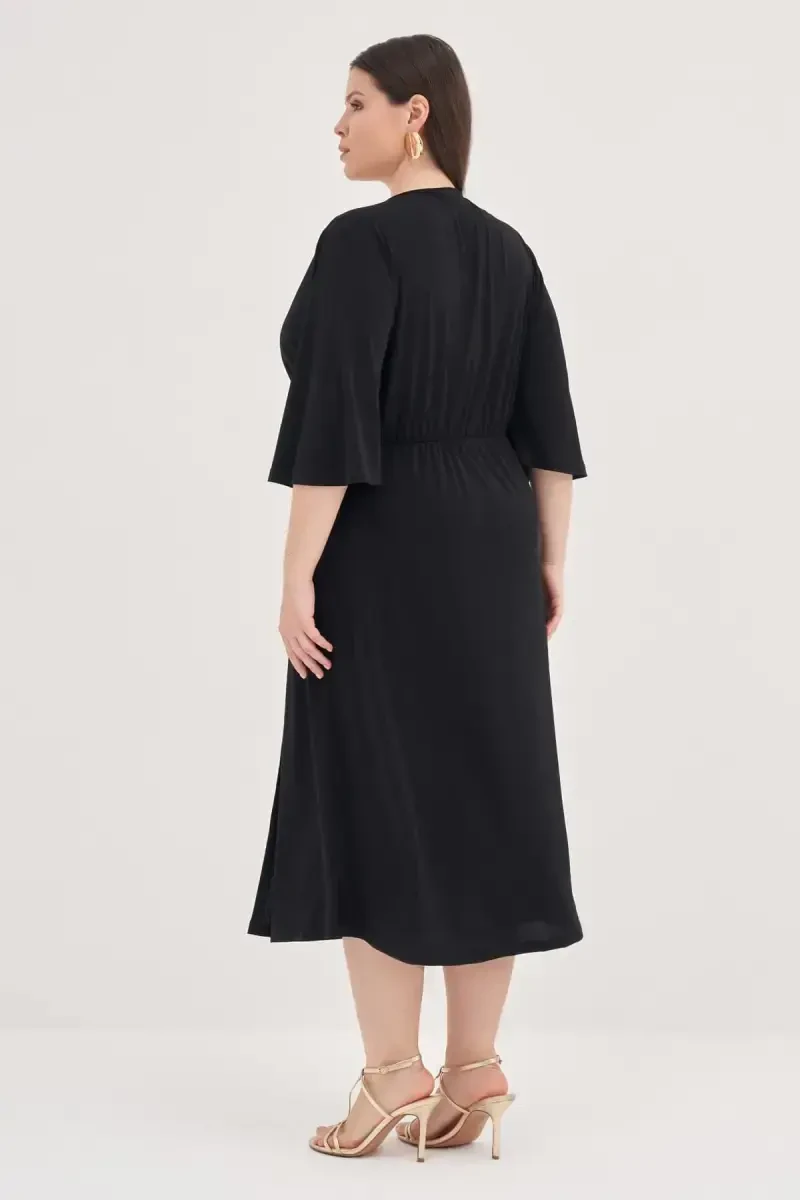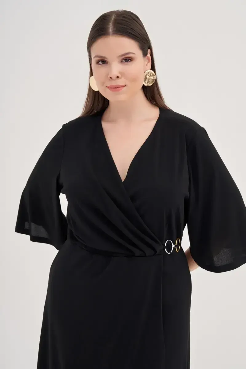 Katta o'lchamdagi qora o'ralgan ko'ylak | Halqali detallarga ega midi bo'yli zamonaviy ko'ylak