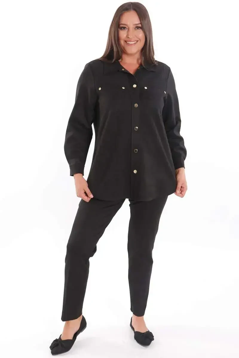 katta o'lchamli ko'ylak, zamsh ko'ylak, tugmachali ko'ylak, lazer bilan kesilgan ko'ylak, qora ko'ylak, ayollar ko'ylagi, katta o'lchamli ayollar kiyimi, cho'ntak detallari bilan ko'ylak, yelka detallari bilan ko'ylak, qulay ko'ylak
