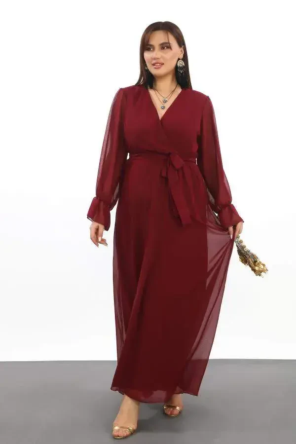 **KL3085 Yag'li ayollar uchun uzun bordo shifonli kamzuli bayramona xalat**
