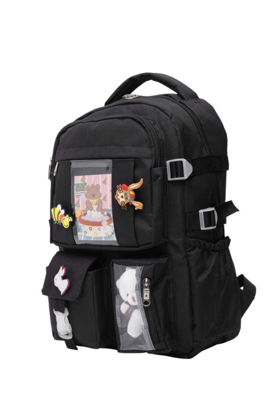 **Полный набор аксессуаров:** Этот школьный рюкзак, который выделяется своими стильными и практичными аксессуарами, предлагает дополнительные функции, такие как водонепроницаемый чехол для зонтика, пенал, брелок и небольшое зеркало. Таким образом, вы можете собрать все свои потребности в одной сумке.