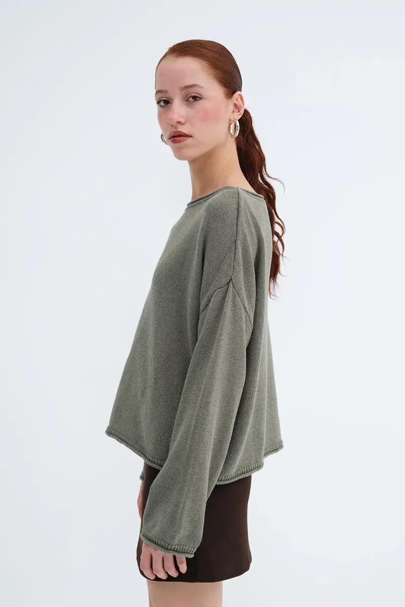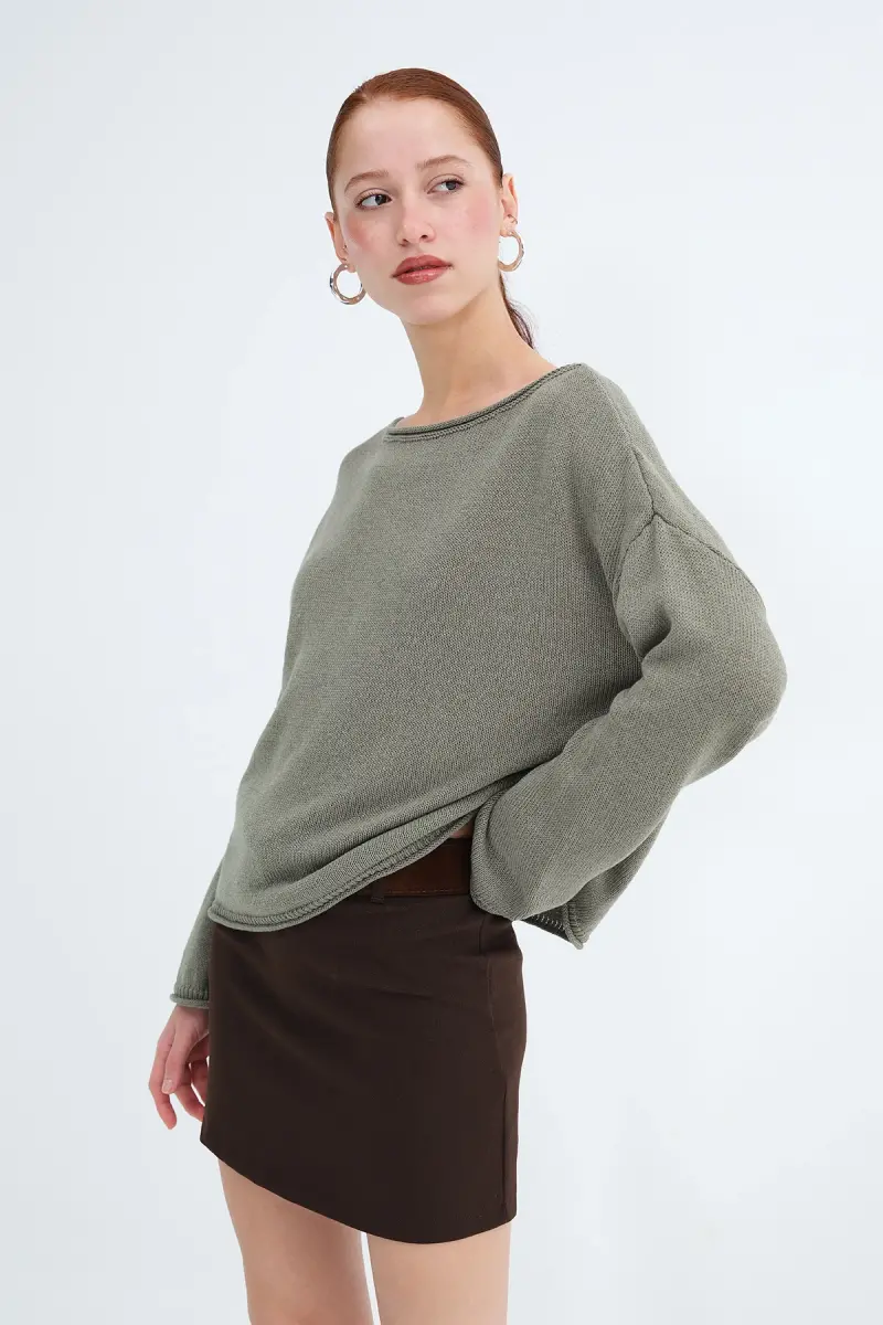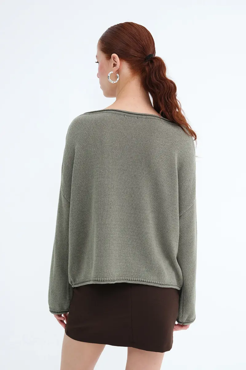 Kayık Yaka Triko Kazak K10237-A5-Adaçayı