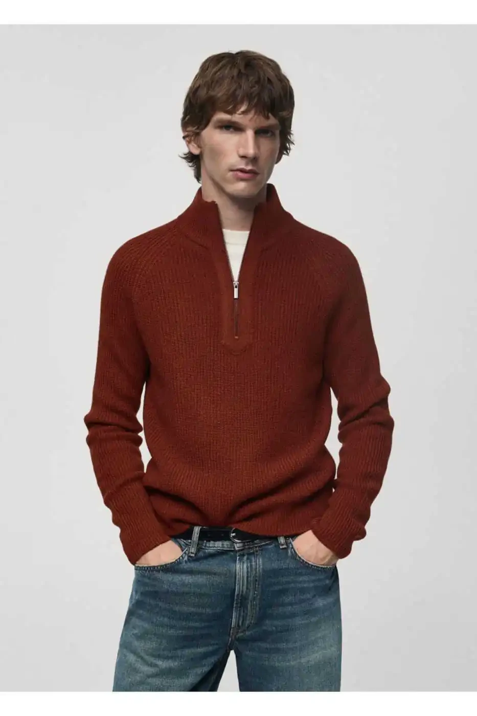 Mango kadın kazak, karma yün kumaş, fermuarlı perkins yaka, lastik süslemeler, ücretsiz iade