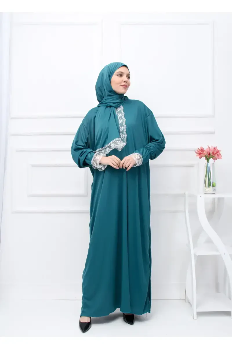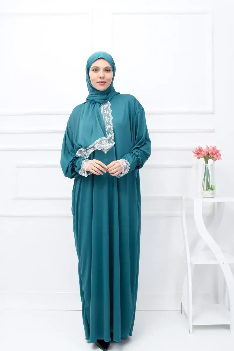 Kendinden Başörtülü Şık Kadın Namaz Elbisesi - Yeşil, ibadetinizi huşu içinde gerçekleştirirken zarafetinizden ödün vermek istemeyen kadınlar için özel olarak tasarlandı. DEFKA EV GİYİM güvencesiyle sunulan bu eşsiz namaz elbisesi, türbanın elbiseye dikişli birleşik olması sayesinde pratik bir kullanım sunar. Başörtüsü arayışına son veren bu tasarım, ibadet öncesi hazırlıklarınızı kolaylaştırır ve size zamandan tasarruf etmenizi sağlar.Elbisenin kolları lastikli ve zarif dantel işlemeleriyle süslenmiştir. Bu detaylar, elbiseye şık bir dokunuş katarken, kullanım kolaylığı da sunar. Yaka kısmında bulunan şık dantel detayı ise, elbisenin genel estetiğini tamamlar ve ona sofistike bir hava katar.İç göstermeyen kumaşı sayesinde gönül rahatlığıyla ibadetinizi gerçekleştirebilirsiniz. Hafif kumaşı sayesinde kolayca çantaya sığabilen bu namaz elbisesi, seyahatlerinizde ve günlük kullanımınızda size eşlik etmeye hazırdır.Ürünün kalitesi ve şıklığıyla ön plana çıkmasının yanı sıra, kullanım kolaylığı da sunması, onu diğer namaz elbiselerinden ayırır. İbadetinizi daha huzurlu ve keyifli hale getirmek için tasarlanan bu elbise, gardırobunuzun vazgeçilmez bir parçası olacak.Üstelik, bu özel tasarım namaz elbisesi, kampanya fiyatıyla sunulmaktadır. Bu fırsatı kaçırmayın ve kendinizi veya sevdiklerinizi bu şık ve kullanışlı hediyeyle mutlu edin. DEFKA EV GİYİM kalitesiyle üretilen bu namaz elbisesi, uzun ömürlü kullanım ve şıklığı bir arada sunar.Namaz kılarken hem rahat hem de şık olmak isteyen kadınlar için ideal bir seçim olan Kendinden Başörtülü Şık Kadın Namaz Elbisesi - Yeşil, her detayıyla özenle tasarlanmıştır. İbadetinizi daha anlamlı kılmak ve kendinizi iyi hissetmek için bu özel elbiseyi tercih edebilirsiniz.Bu ürün, stoklarla sınırlıdır. Yoğun talep nedeniyle tükenmeden siparişinizi verin ve bu eşsiz deneyimin tadını çıkarın. İbadetlerinizi huşu içinde yaparken, şıklığınızdan da ödün vermeyin. Kendinden Başörtülü Şık Kadın Namaz Elbisesi - Yeşil ile hem rahat hem de zarif olun. Unutmayın, bu fırsat bir daha gelmeyebilir!