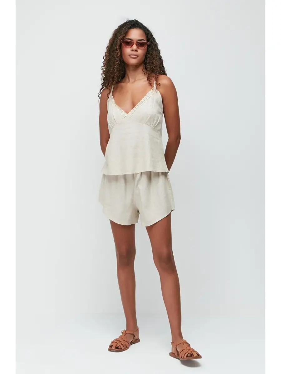 Gardırobunuzun vazgeçilmezi olacak Keten Dantel Detay Atlet Şort Takım 9146 Bej-Bej ile tanışın! Bu şık ve rahat takım, yaz aylarının sıcak günlerinde hem konforu hem de zarafeti bir arada sunuyor. Candcity kalitesiyle tasarlanan bu eşsiz takım, %100 keten kumaşı sayesinde gün boyu ferahlık sağlarken, dantel detayları ile de feminen bir dokunuş katıyor. İster evde dinlenirken, ister arkadaşlarınızla keyifli bir gün geçirirken, isterseniz de tatilde valizinize atacağınız ilk parça olacak bu takım, her ortamda stilinizi yansıtmanıza yardımcı olacak.Takımın atlet kesimli üst parçası, vücudunuzu nazikçe saran ve hareket özgürlüğünüzü kısıtlamayan bir tasarıma sahip. V yaka detayı, dekoltenizi zarif bir şekilde vurgularken, ince askıları da omuzlarınızı ön plana çıkarıyor. Bej renginin sakinleştirici ve doğal tonu, her cilt tonuna uyum sağlarken, dantel detayları da takıma romantik bir hava katıyor. Şort ise, rahat kesimi ve beli lastikli yapısı sayesinde gün boyu konforlu bir kullanım sunuyor. Keten kumaşın hafifliği, sıcak havalarda terlemeyi önlerken, dantel detayları da şortun sade tasarımına hareketlilik katıyor.Bu takım, sadece rahatlığı ve şıklığı bir arada sunmakla kalmıyor, aynı zamanda çok yönlü kullanım imkanı da sağlıyor. Atlet ve şortu ayrı ayrı kombinleyerek farklı stiller yaratabilirsiniz. Örneğin, atleti jean şort veya etekle kombinleyerek günlük bir görünüm elde edebilir, şortu ise şık bir bluz veya gömlekle tamamlayarak daha özel bir etkinlik için hazırlık yapabilirsiniz.Keten Dantel Detay Atlet Şort Takım 9146 Bej-Bej, Candcity'nin özenle tasarladığı ve kaliteli malzemeler kullandığı bir üründür. Uzun ömürlü kullanım için lütfen yıkama talimatlarına uyunuz. Bu takım, gardırobunuzun en sevilen parçalarından biri olmaya aday! Şimdi sipariş verin ve yazın keyfini çıkarın!