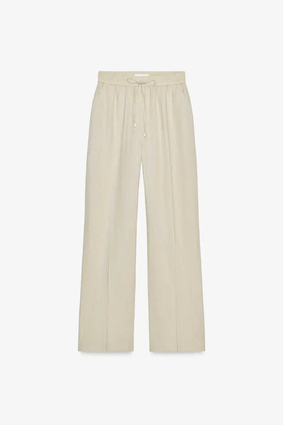 KETEN KARIŞIMLI DÜZ KESİM PANTOLON-Açık bej. Düz kesim. Normal yükseklikte. Keten karışımlı. Yan cepli. Düğmeli ve fermuarlı.