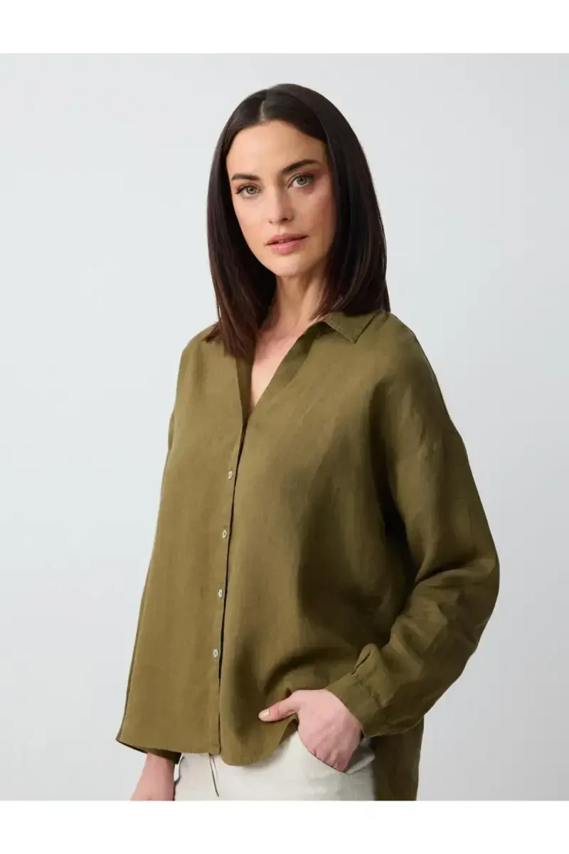 Khaki Long Sleeve Basic Linen Shirt - Comfort and Style Combined