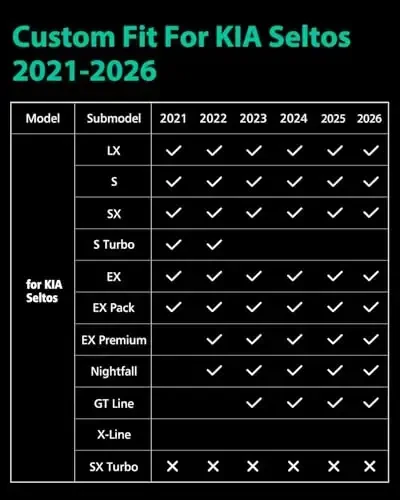 - Tam Uyumluluk: 2024, 2023, 2022 ve 2021 model KIA Seltos araçlara özel olarak tasarlanmıştır. (Seltos SX Turbo modeli için uygun değildir.)